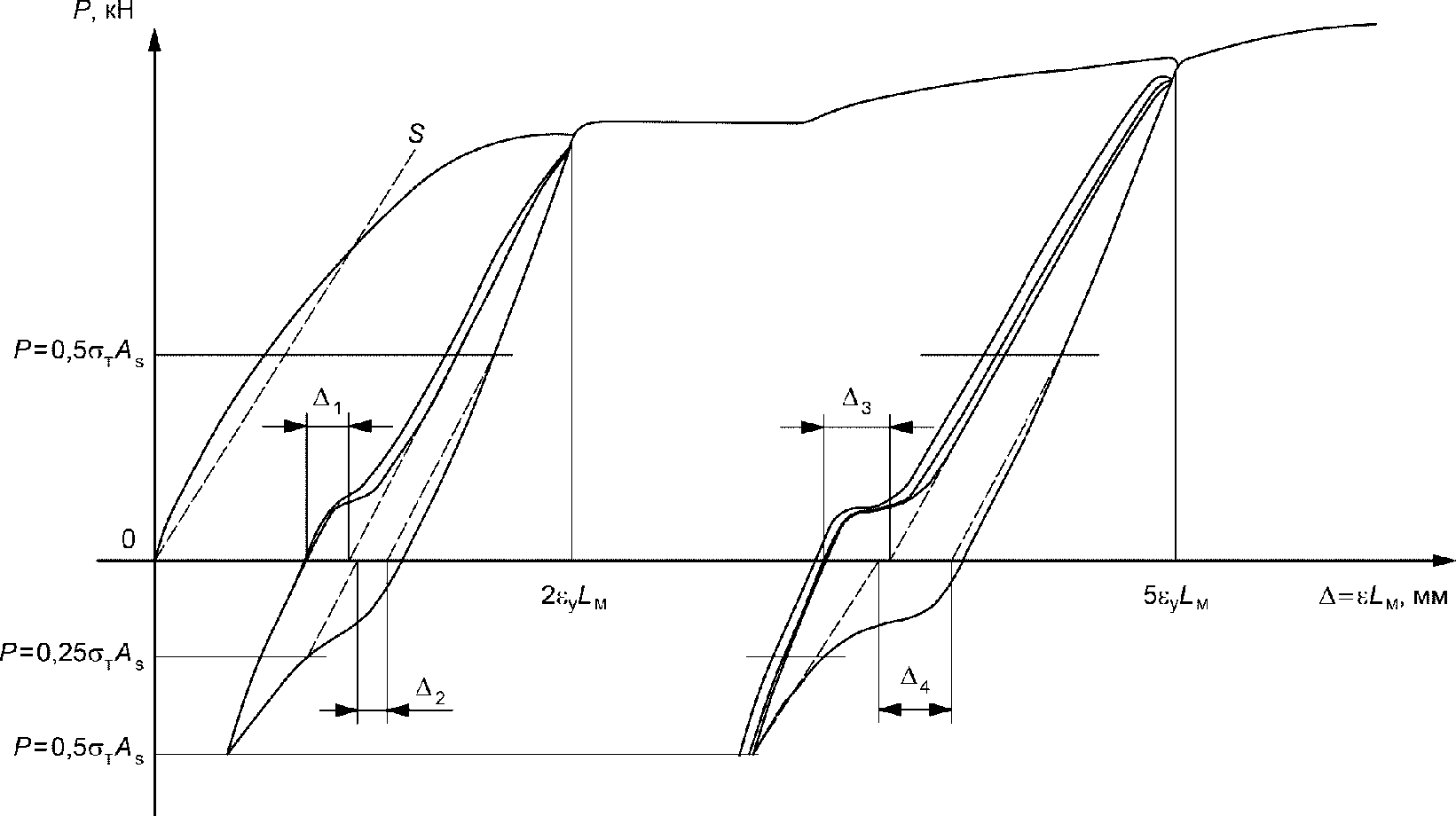 S, проведенными от уровня растягивающих напряжений во время разгружения образца, соответствующих
