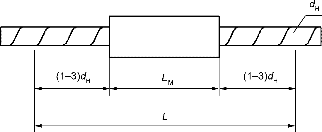 7.1.6 База измерения деформаций L при испытании образцов механических соединений должна быть равна длине соединительной муфты Lм плюс расстояние, равное не менее одного диаметра dн и не более 3dн соединяемых арматурных стержней, отложенных с каждой стороны муфты (рисунок 2).