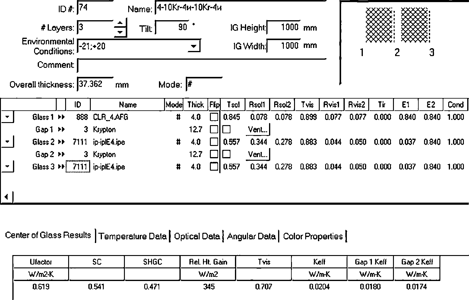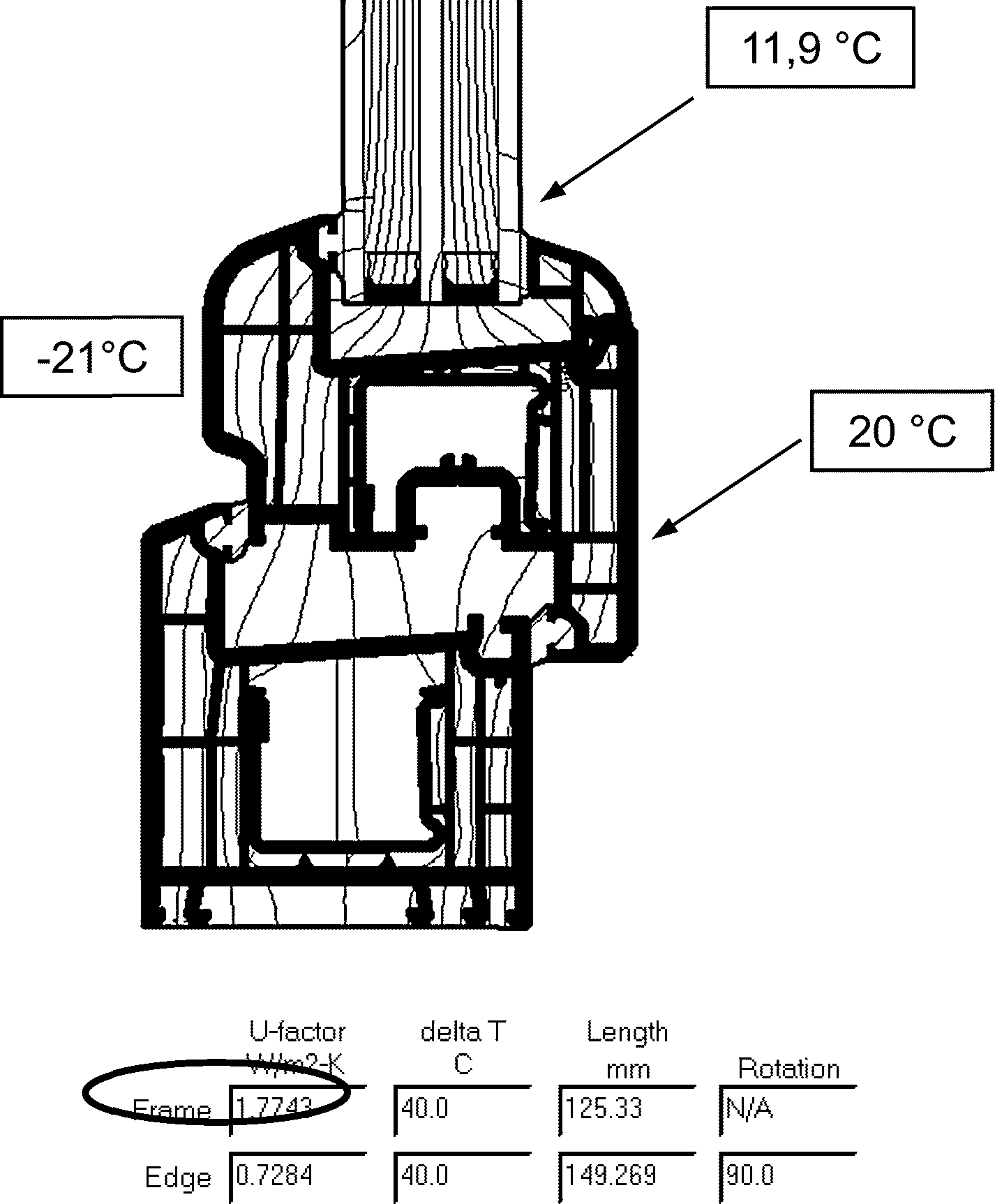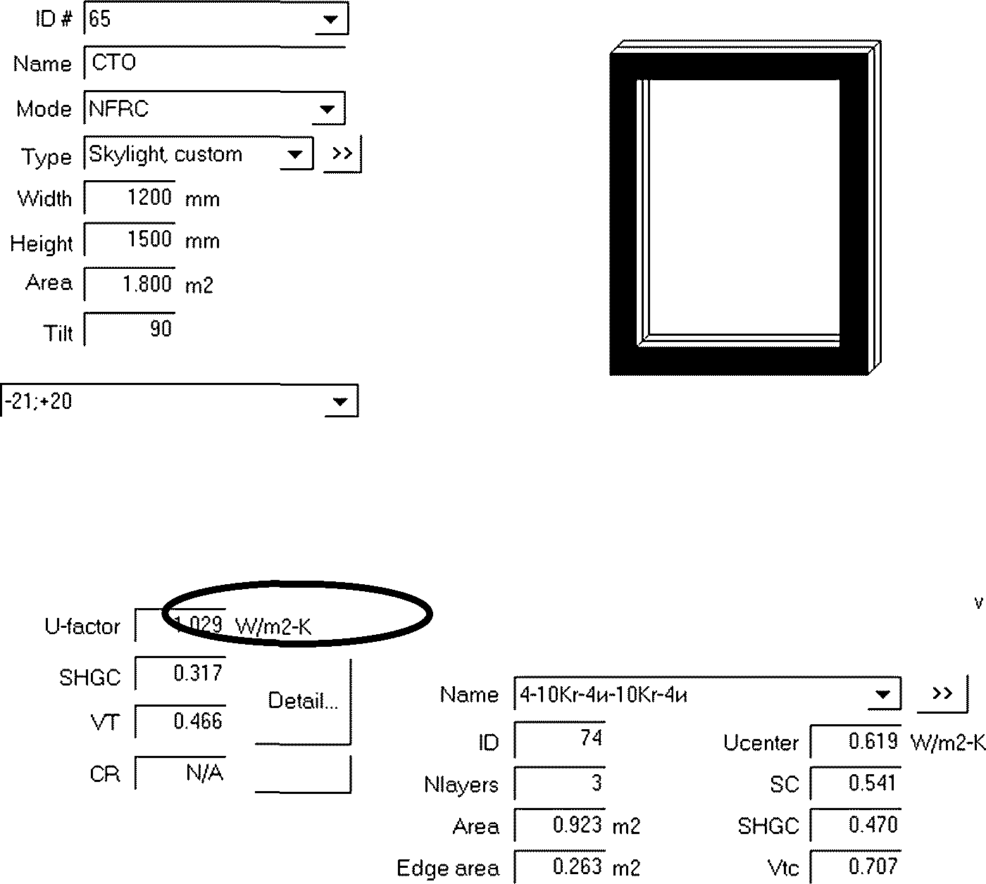 Ниже приведены результаты теплотехнического расчета, установленного в проем окна размерами в свету 1175 x 1475 мм, со стеклопакетом СПД 4-10kr-4И-10kr-4И с двумя мягкими теплоотражающими покрытиями с криптоновым заполнением, с теплой дистанционной рамкой и с пятикамерным ПВХ профилем по представленной выше методике: