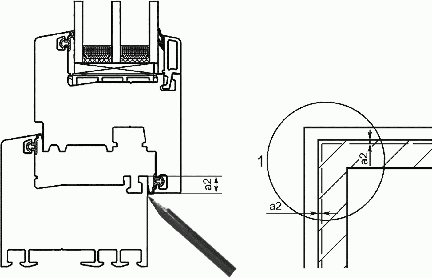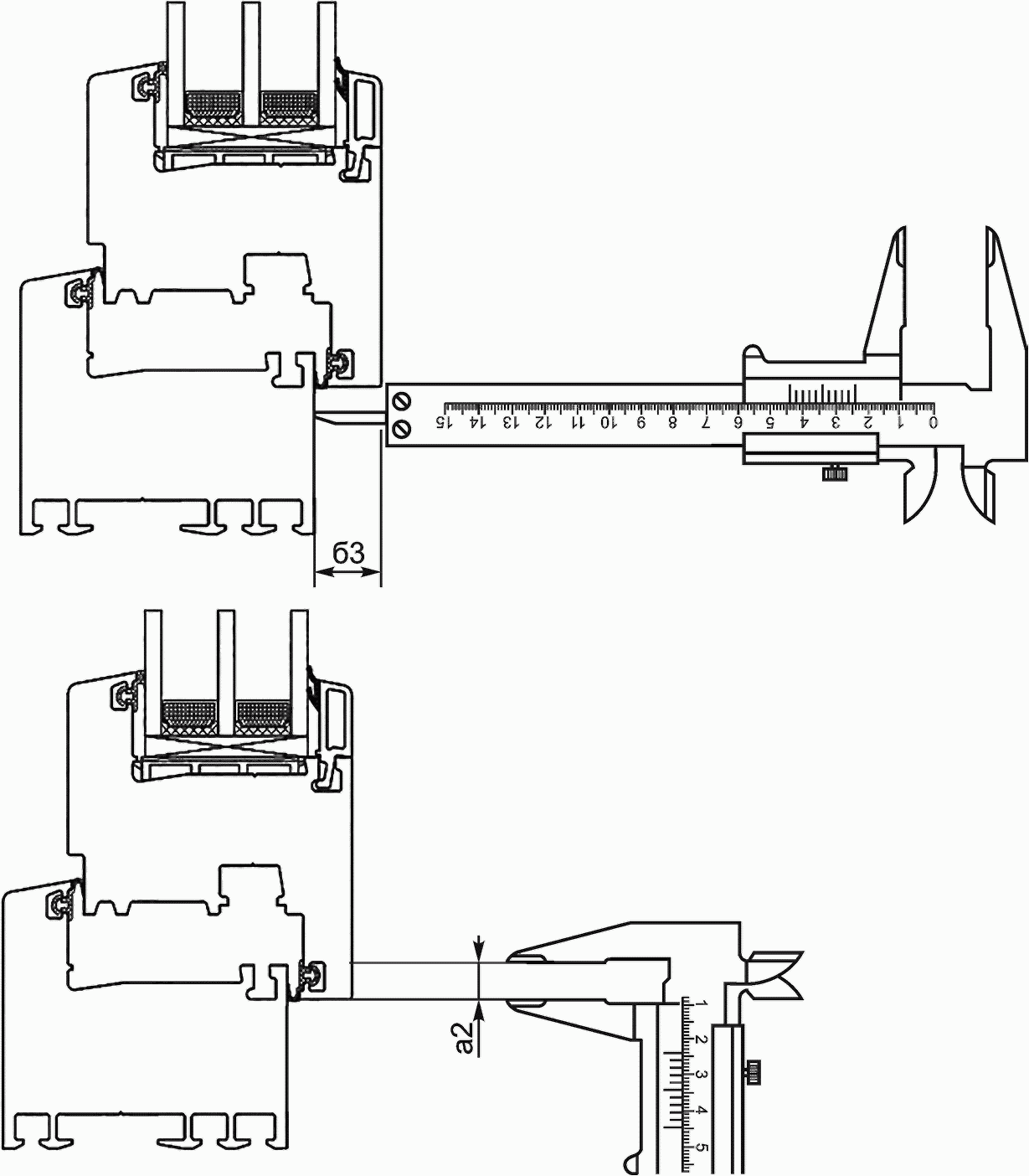 - обследование внешнего вида витража. Перепад лицевых поверхностей (провес) в угловых и Т-образных соединениях смежных деталей коробок, установка которых предусмотрена в одной плоскости, не должен превышать 1 мм. Зазоры в местах угловых и Т-образных соединений профилей не должны превышать 0,5 мм;