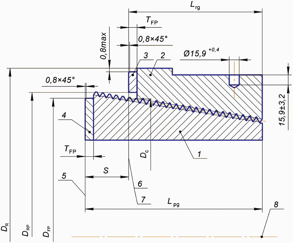 В настоящем стандарте приведены обязательные требования к геометрическим параметрам резьбовых упорных соединений и их покрытию, дополнительные требования к разгрузочным элементам, контрольным меткам, холодному деформационному упрочнению и приработке соединений, а также правила приемки и методы проведения контроля соединений, требования к применяемым для контроля резьбовым калибрам и рекомендации по применению измерительных приборов. Настоящий стандарт распространяется на следующие типы резьбовых упорных соединений: - FH - тип соединения с широким проходным отверстием с профилем резьбы V-040 или V-050. Примечание - Число в обозначении типа соединения означает ранее используемый наружный диаметр бурильной трубы в дюймах; - NC - соединение нумерационного типа с профилем резьбы V-038R. Примечание - Число в обозначении типа соединения является кратностью среднего диаметра резьбы в основной плоскости в мм к 2,54 мм, выраженной в виде целого значения; - REG - соединение обычного типа с профилем резьбы V-040, V-050 или V-055. Примечание - Число в обозначении типа соединения означает ранее используемый наружный диаметр бурильной трубы в дюймах; - З - тип замкового соединения по ГОСТ 28487 с профилем резьбы V-038 или V-040 или V-050 или V-055. Примечание - Число в обозначении типа соединения означает наружный диаметр большего основания конуса ниппельного конца в миллиметрах, округленный до целого значения. Резьбовые упорные соединения выполняют с правым направлением резьбы (правой резьбой). Соединения с левым направлением резьбы (левой резьбой) могут быть изготовлены по настоящему стандарту, если нарезчик имеет сертифицированные или калиброванные контрольные калибры для соединений с такой резьбой, либо имеет доступ к ним. |