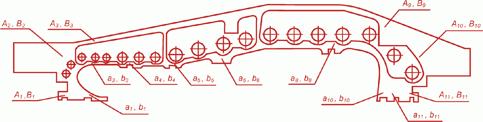 Зазоры в разъеме при свободном наложении крышки турбины | Левая сторона | Обозначение | A1 | A2 | A3 | a1 | a4 | a6 | a7 | a7 | a9 | a10 | a11 | a12 | a16 | A13 | A14 | A16 |