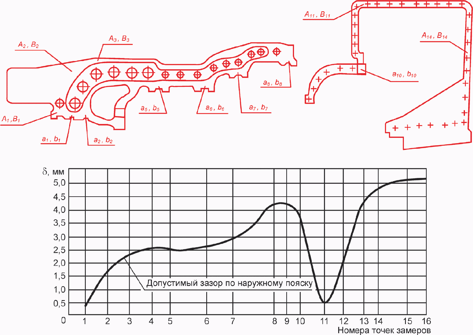 Зазоры в разъеме при свободном наложении крышки турбины | Левая сторона | Обозначение | A1 | A2 | A3 | a1 | a1 | a2 | a6 | a8 | a9 | a11 | a12 | A10 | A11 | A12 |