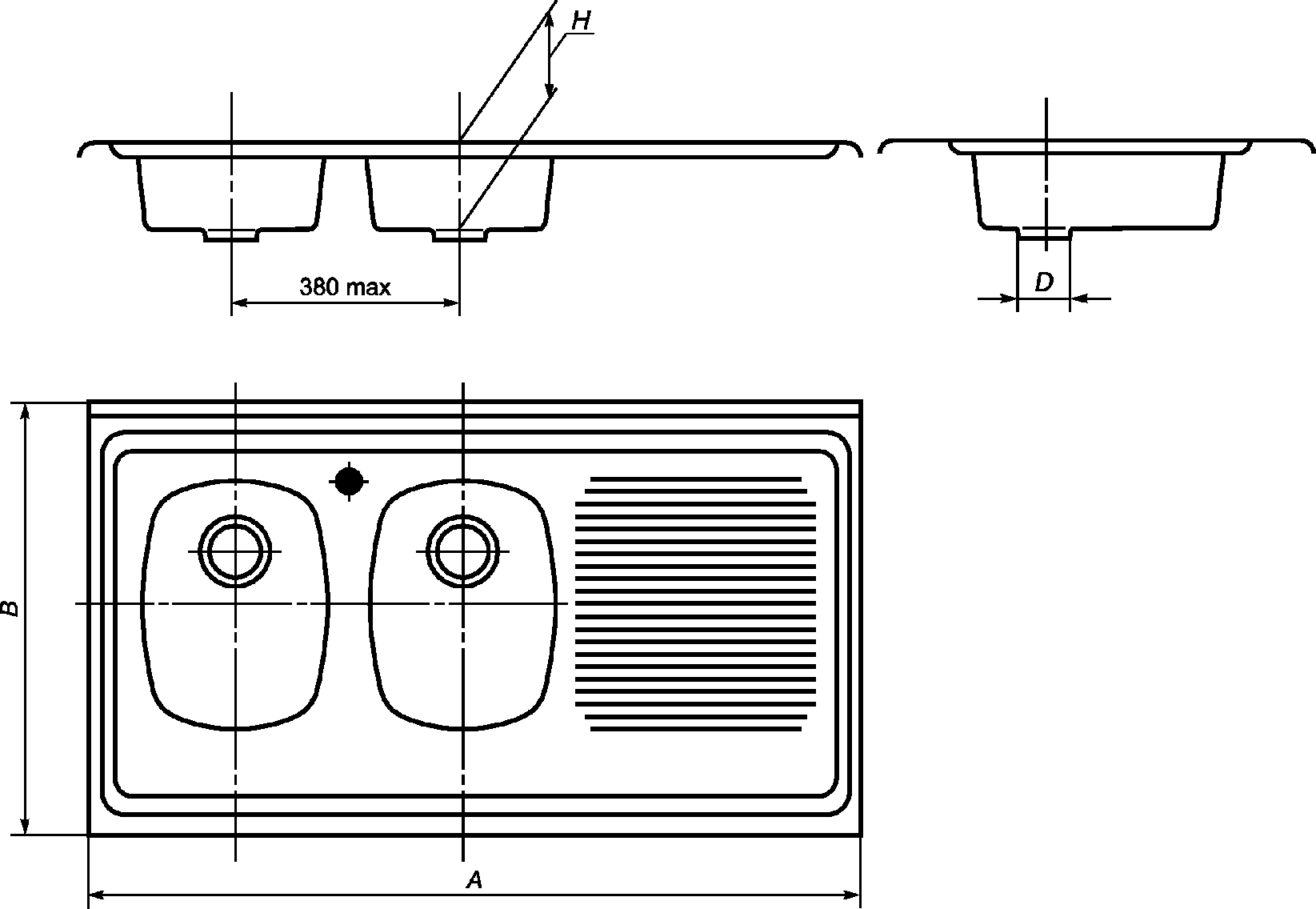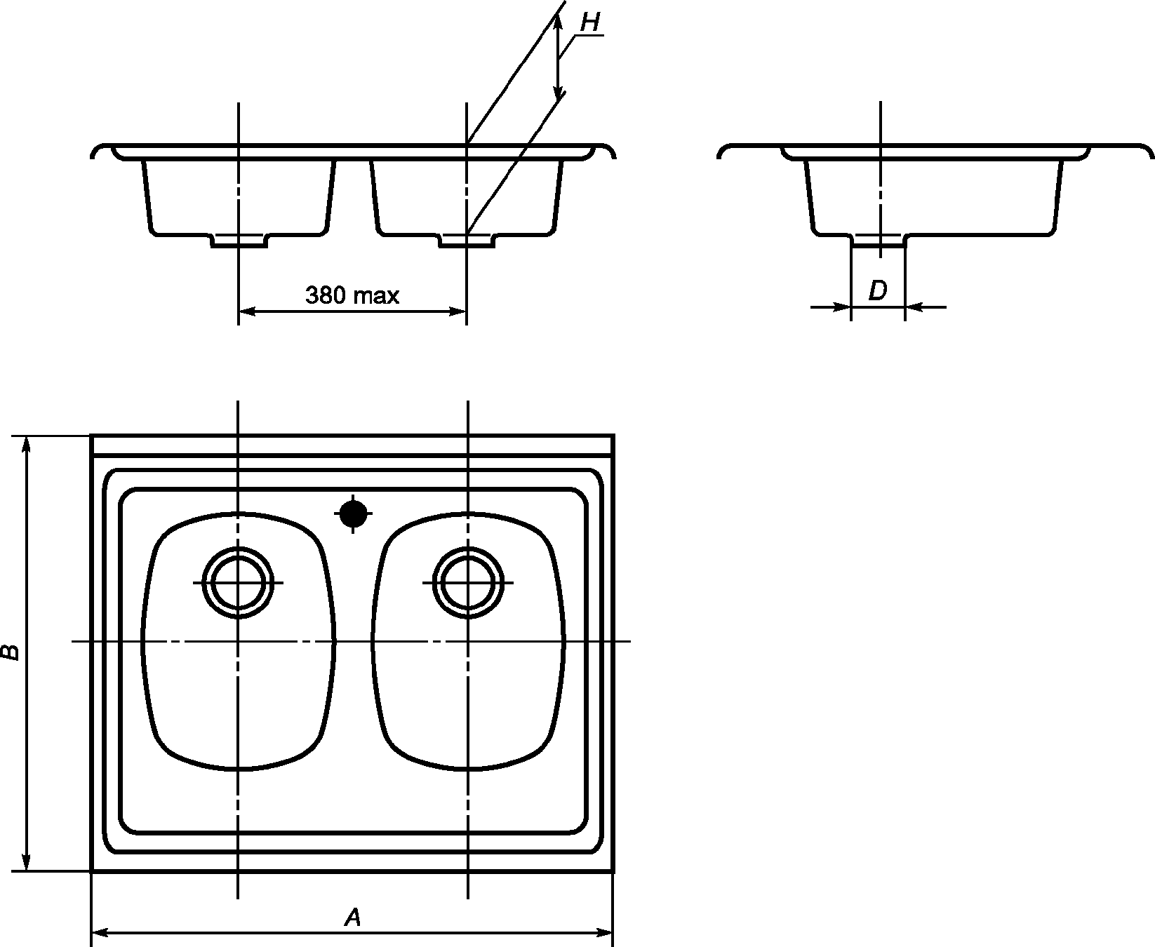 Тип мойки | Длина A +/- 3 | Ширина B +/- 3 | Глубина чаши H, не менее |