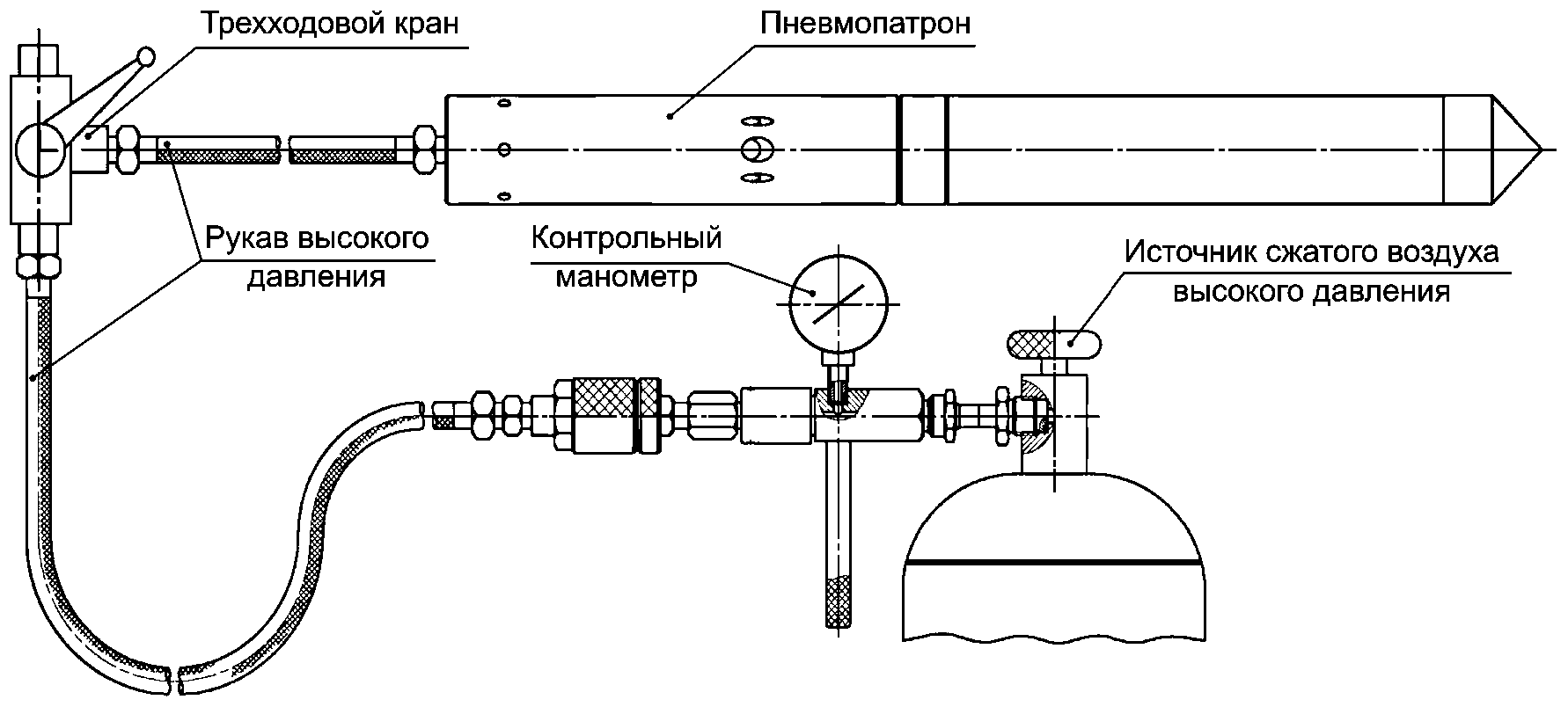 12.5 Для выполнения работ с пневмопатроном используют шланговую и запорную арматуру, обеспечивающую подачу и контроль давления сжатого воздуха, для полуавтоматического пневмопатрона - возможность сброса давления в подводящей магистрали. Принципиальная схема соединения пневмопатрона показана на рисунке 4.