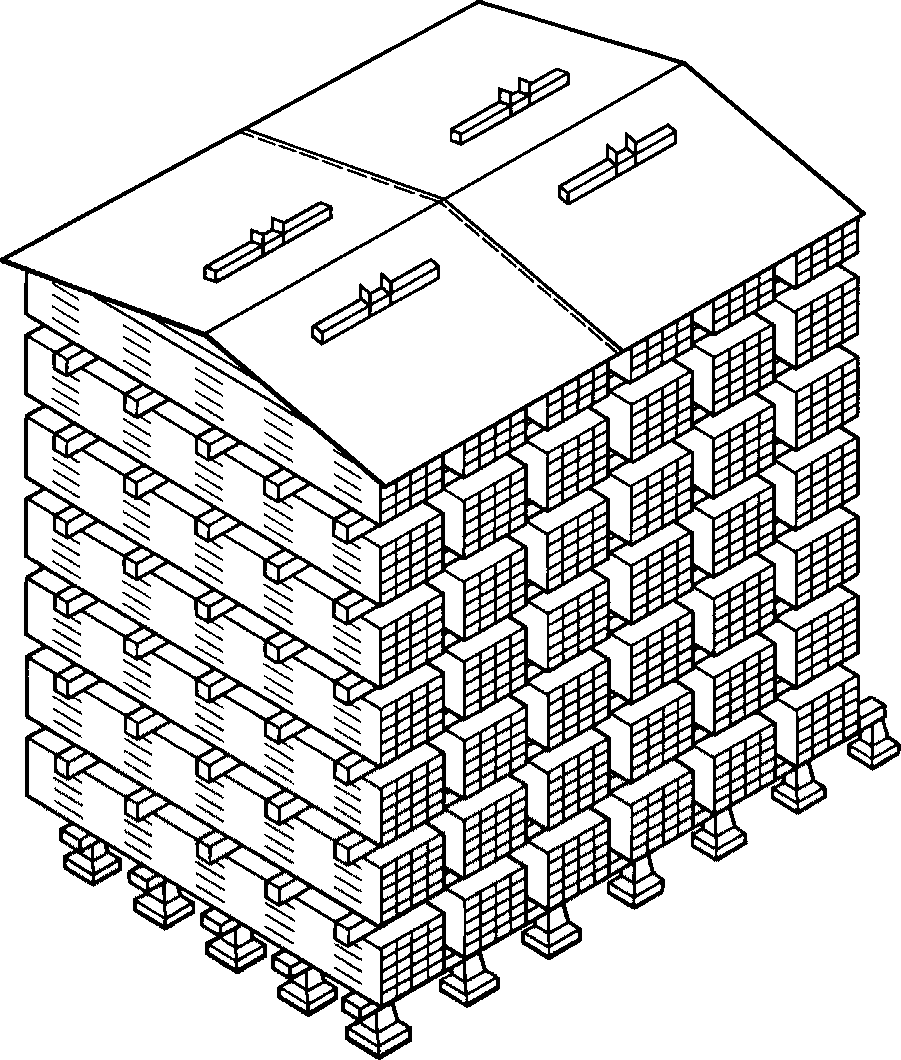 4.2 Пакетный штабель для сушки пиломатериалов состоит из сушильных пакетов, одинаковых по размерам поперечного сечения и уложенных на фундамент горизонтальными и вертикальными рядами (см.