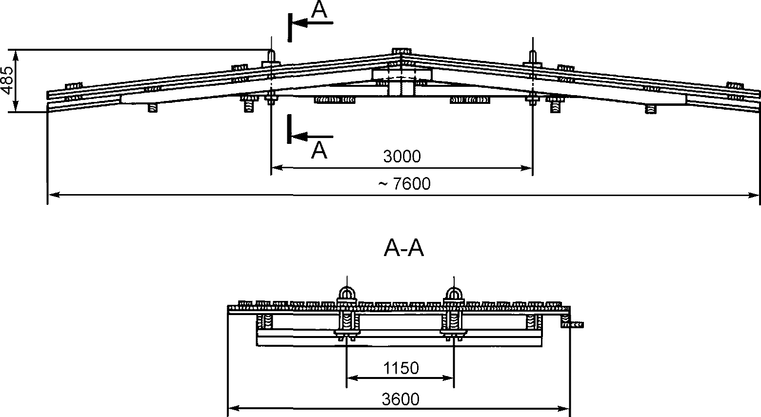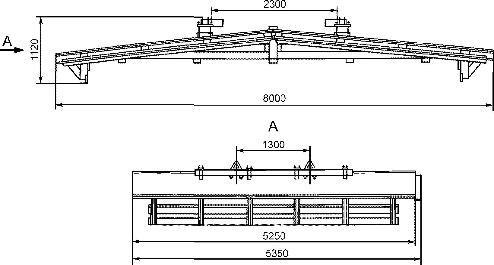 4.19 При формировании пакетных штабелей пиломатериалов каждый законченный вертикальный ряд пакетов (или несколько рядов) покрывают одно- или двухскатной секционной съемной крышей. Щели между отдельными крышами должны быть перекрыты. Уклон крыш должен быть не менее 60 мм на 1 м ее длины. Нижний конец должен иметь свесы не менее 500 мм для штабелей высотой не более 10 м и не менее 700 мм - для штабелей высотой более 10 м. В промежутках между смежными вертикальными рядами пакетов величина свесов должна быть не менее 100 мм. Схема съемной крыши при формировании штабеля краном приведена на