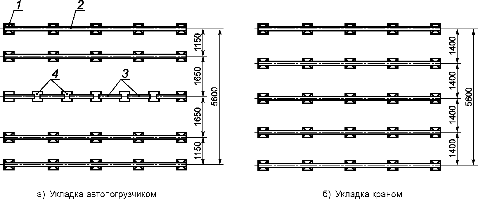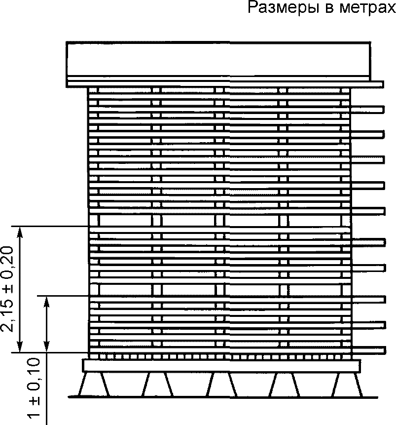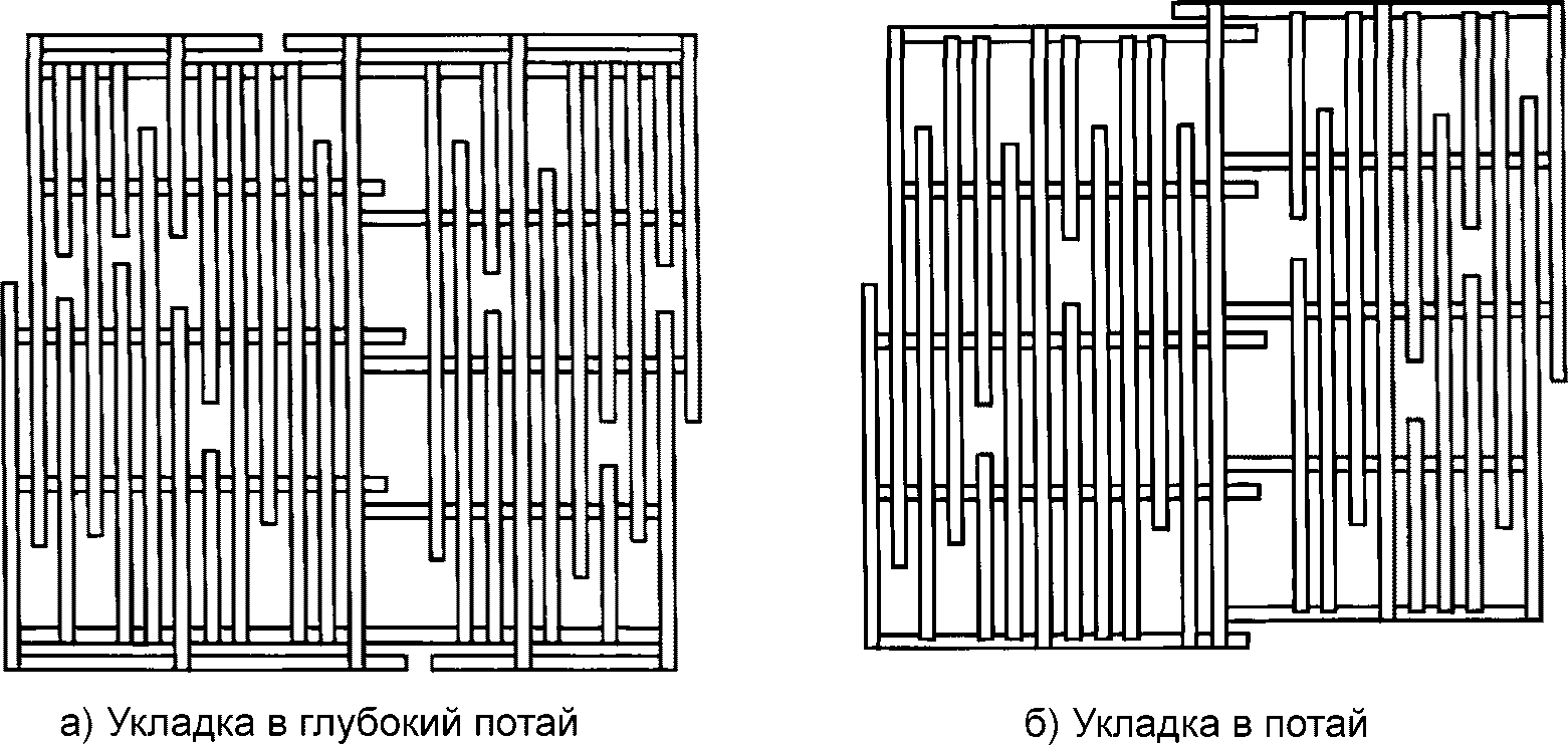 рисунок А.6 приложения А). Размеры пакета определены технической характеристикой применяемых подъемно-транспортных механизмов и оборудования. Длина пакета должна быть не более 7 м. Ширина штабеля определена длиной укладываемых пакетов или суммой длин стыкуемых пакетов, длина - технической характеристикой применяемых механизмов. Высота штабеля при крановой укладке, включая высоту фундамента и крыши, должна быть не более 12 м, а при укладке автопогрузчиком - не более 7 м.