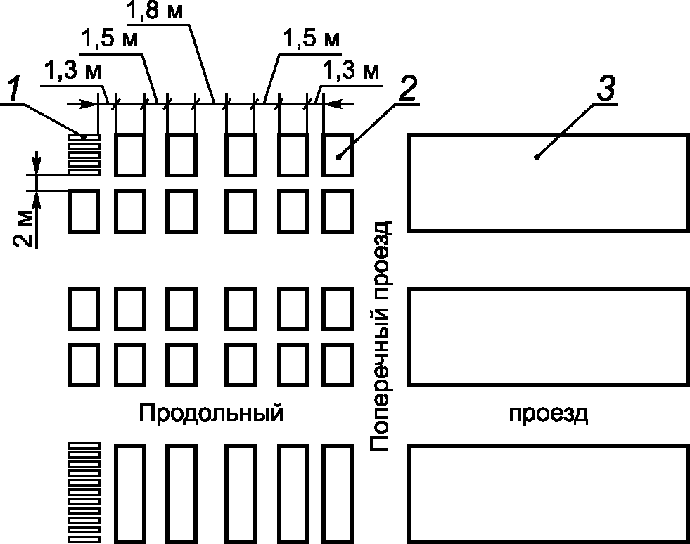 3.5 Группы штабелей отделены друг от друга продольными проездами шириной не менее 10 м и поперечными разрывами или проездами шириной не менее 5 м, одинаковыми по ширине на всем протяжении.