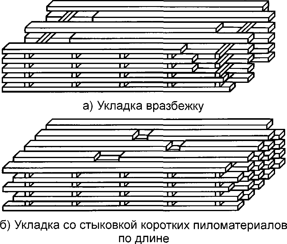 рисунок А.7 б) приложения А]. Торцы пакета должны быть выровнены. Не допускается стыковка коротких пиломатериалов в нижних рядах и крайних стопах пакета.