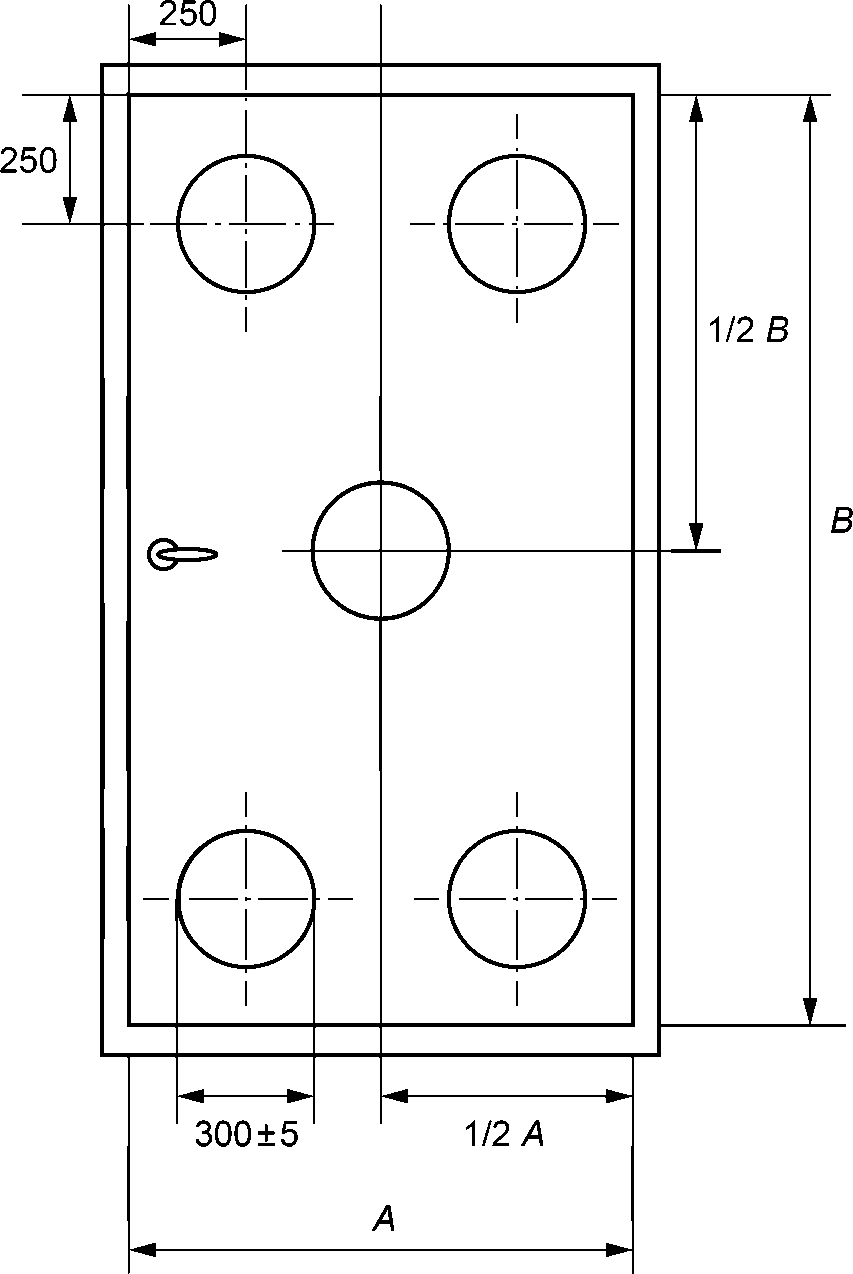 Д.6 Для определения стойкости к воздействию удару остекленных полотен ударное тело (шар) опускают на каждый образец три раза с одной и той же высоты так, чтобы вокруг геометрического центра остекленного участка образца образовался рисунок равностороннего треугольника со стороной (130 +/- 20) мм. Одна сторона треугольника должна быть параллельна короткой стороне образца. Первый удар шара направляют в угол треугольника, который находится напротив данной стороны рисунка треугольника.