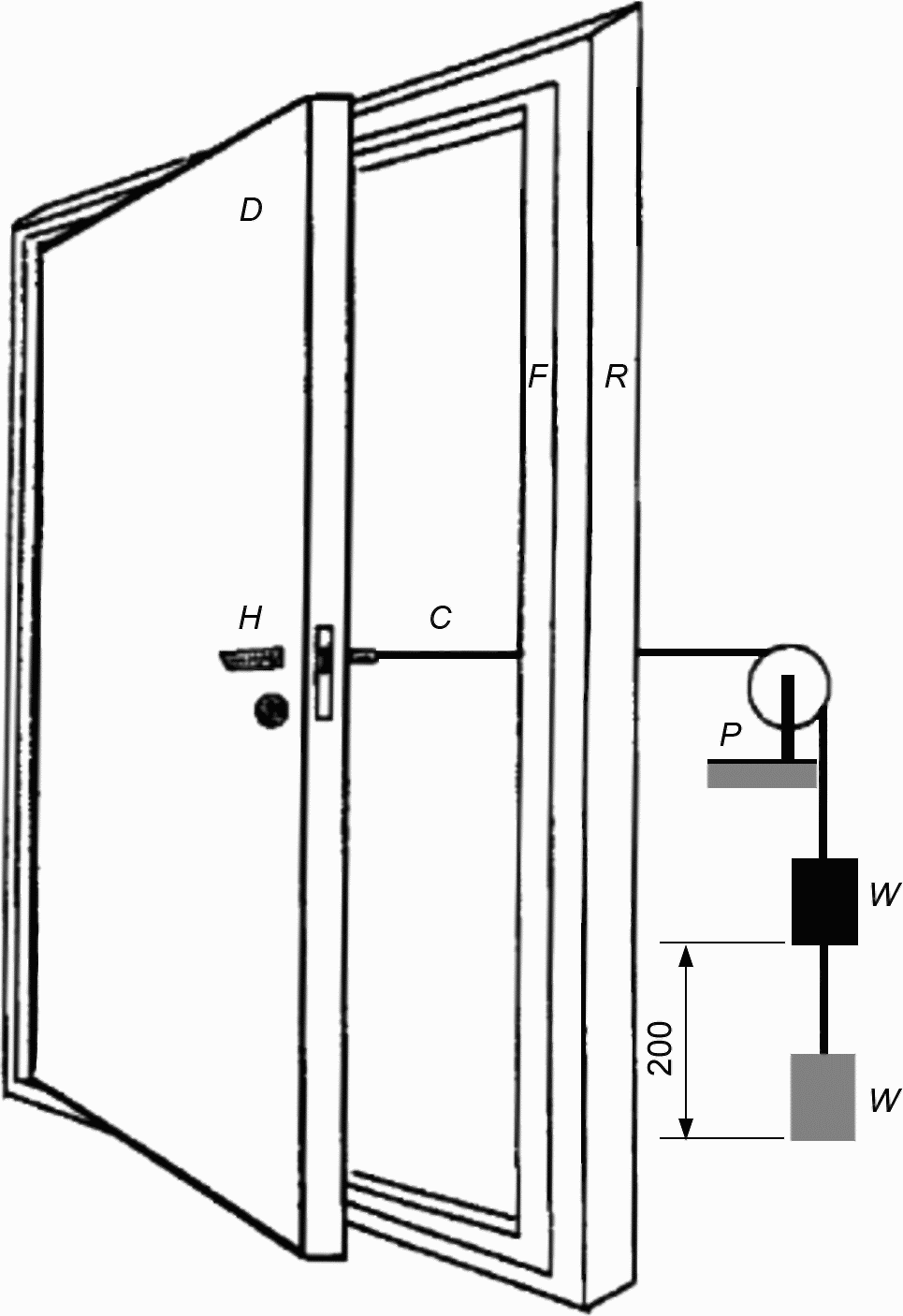 двери; H - ручка; C - шнур; P - блок; W - подвес