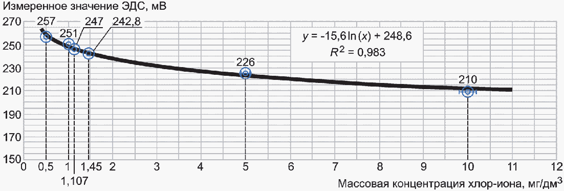 В результате измеренному значению ЭДС, равному 242,8 мВ, соответствует массовая концентрация хлор-иона - 1,45 мг/дм3; 247 мВ - 1,107 мг/дм3.