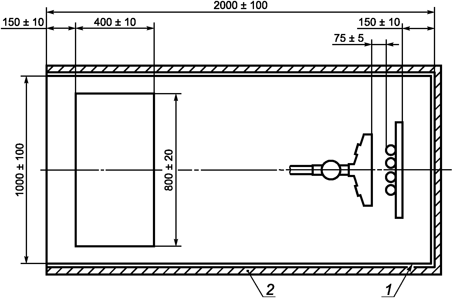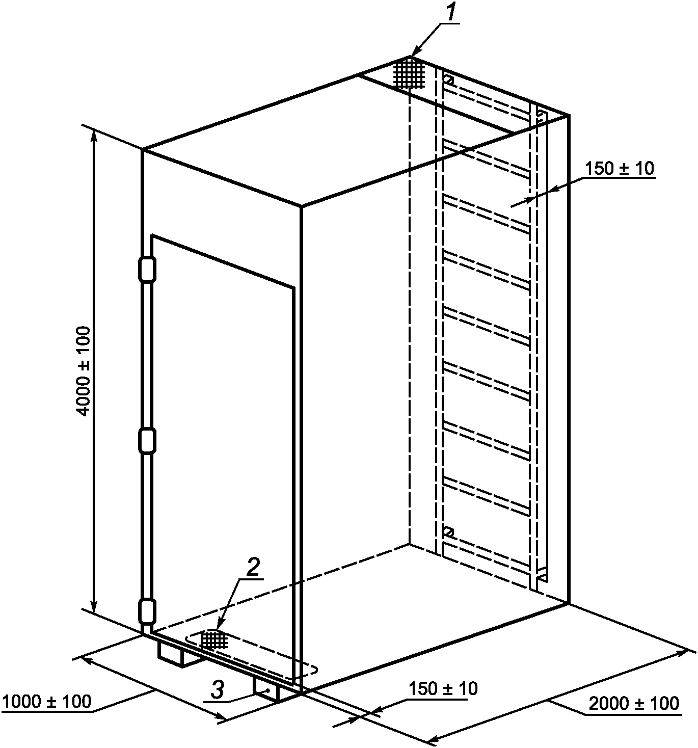 1b) представляет собой вертикальную камеру шириной (1000 +/- 100) мм, глубиной (2000 +/- 100) мм и высотой (4000 +/- 100) мм; пол камеры должен быть приподнят над уровнем пола.