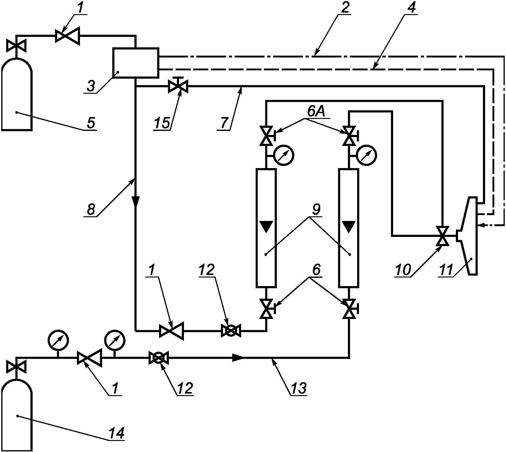 9 - расходомеры; 10 - смеситель Вентури; 11 - горелка;