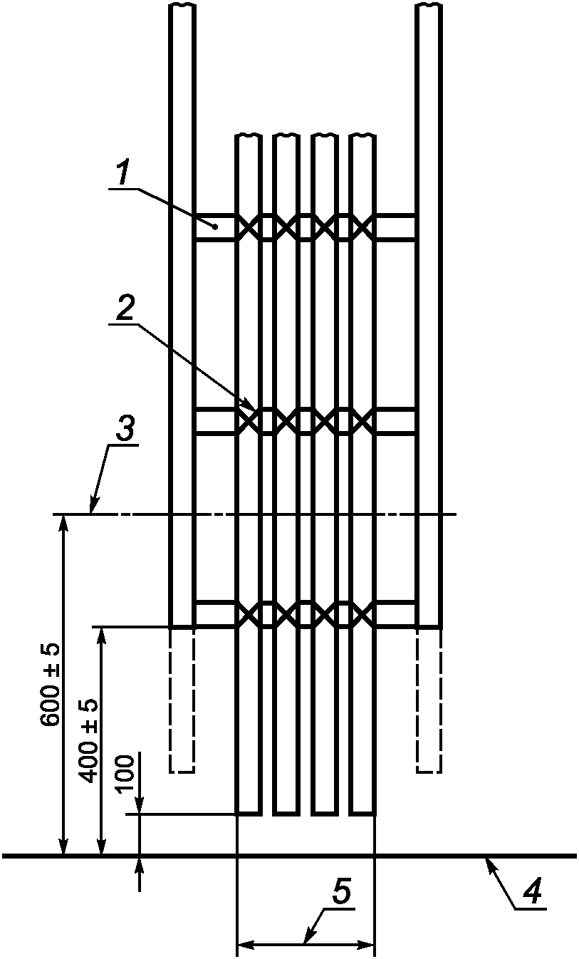 При испытании горелка устанавливается горизонтально на расстоянии (75 +/- 5) мм от передней поверхности образца на высоте (600 +/- 5) мм над полом испытательной камеры, симметрично относительно оси лестницы. Точка приложения пламени горелки находится между двумя перекладинами лестницы (см.