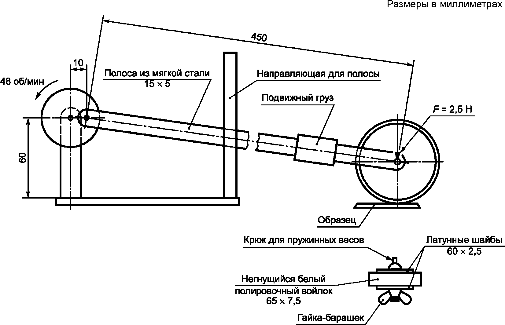 Основная часть состоит из диска, изготовленного из негнущегося белого полировочного войлока (фетра) диаметром 65 мм и толщиной 7,5 мм. Диск заблокирован от вращения и совершает возвратно-поступательные движения по поверхности испытуемого образца с длиной хода 20 мм и с силой прижима диска 2,5 Н к поверхности. При испытании диск совершает 12 ходов (т.е. 12 оборотов эксцентрика) в течение приблизительно 15 с.