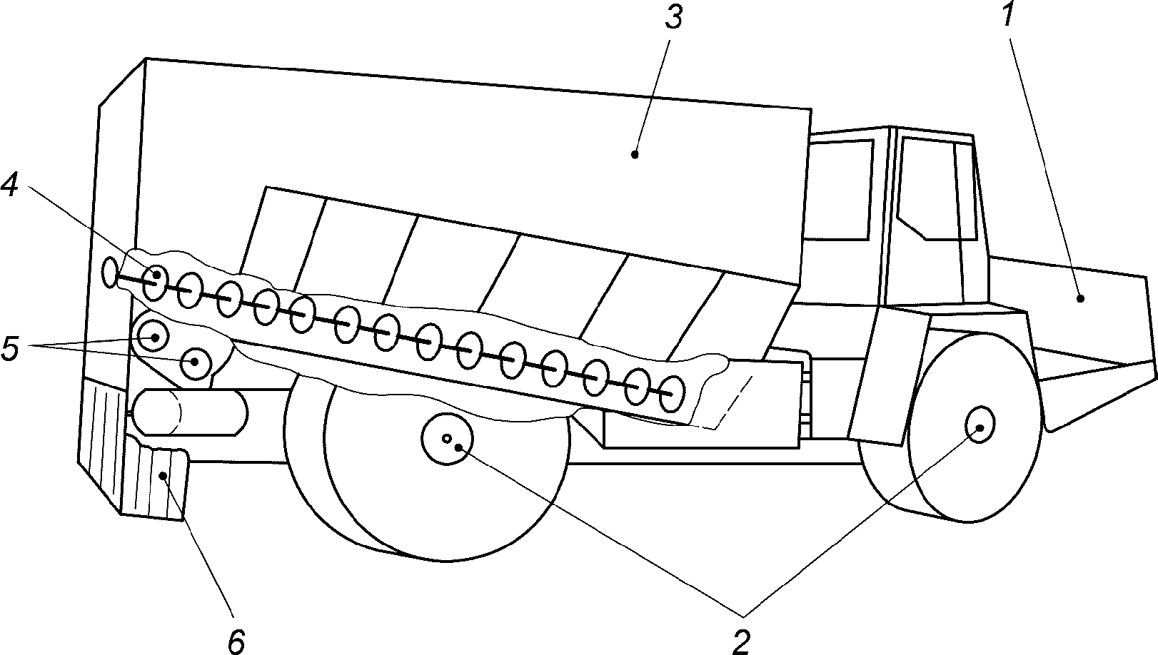 1 - шасси; 2 - бункер для разбрасываемого материала;