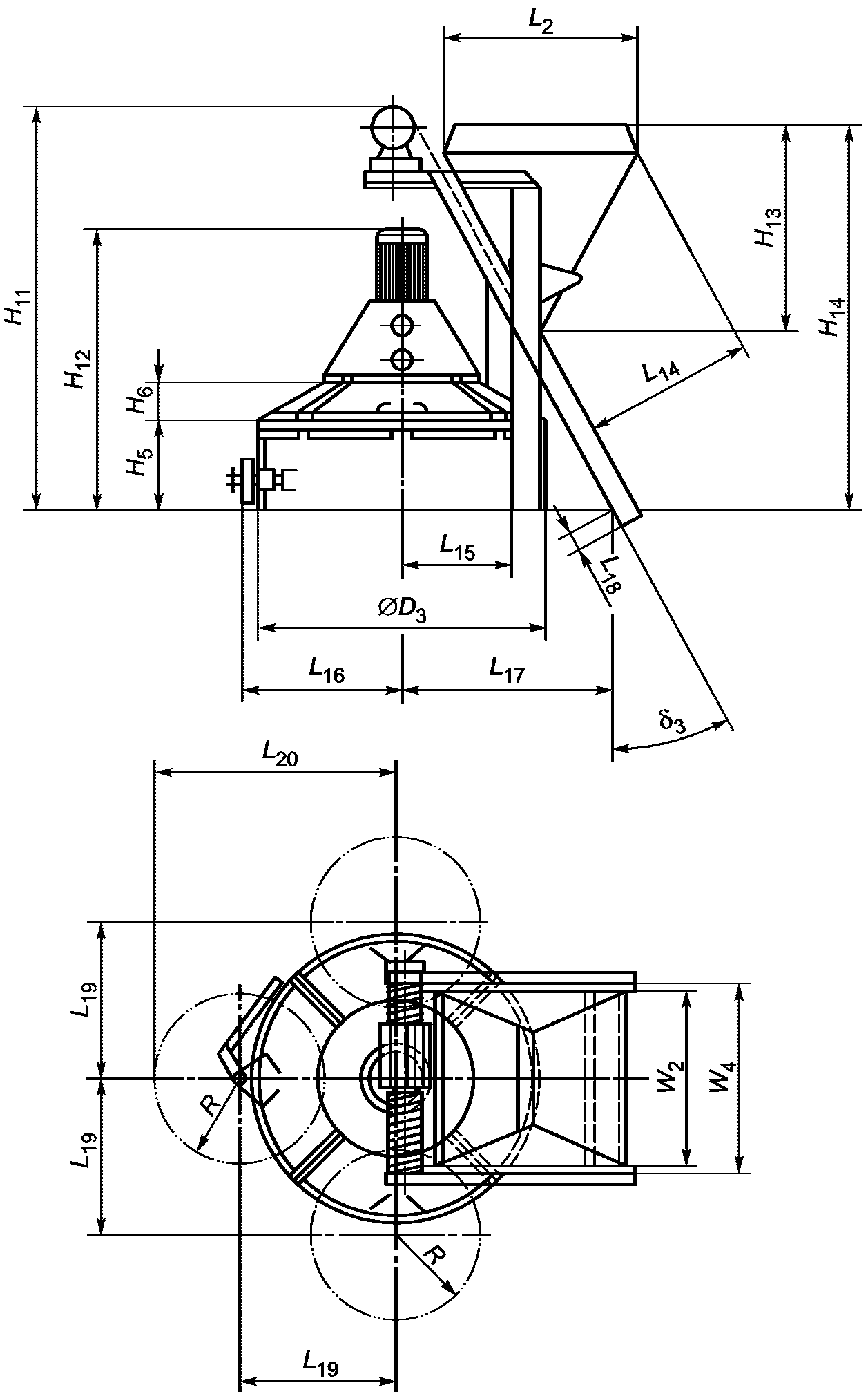 D2 - диаметр чаши; R - радиус поворота шибера разгрузочного