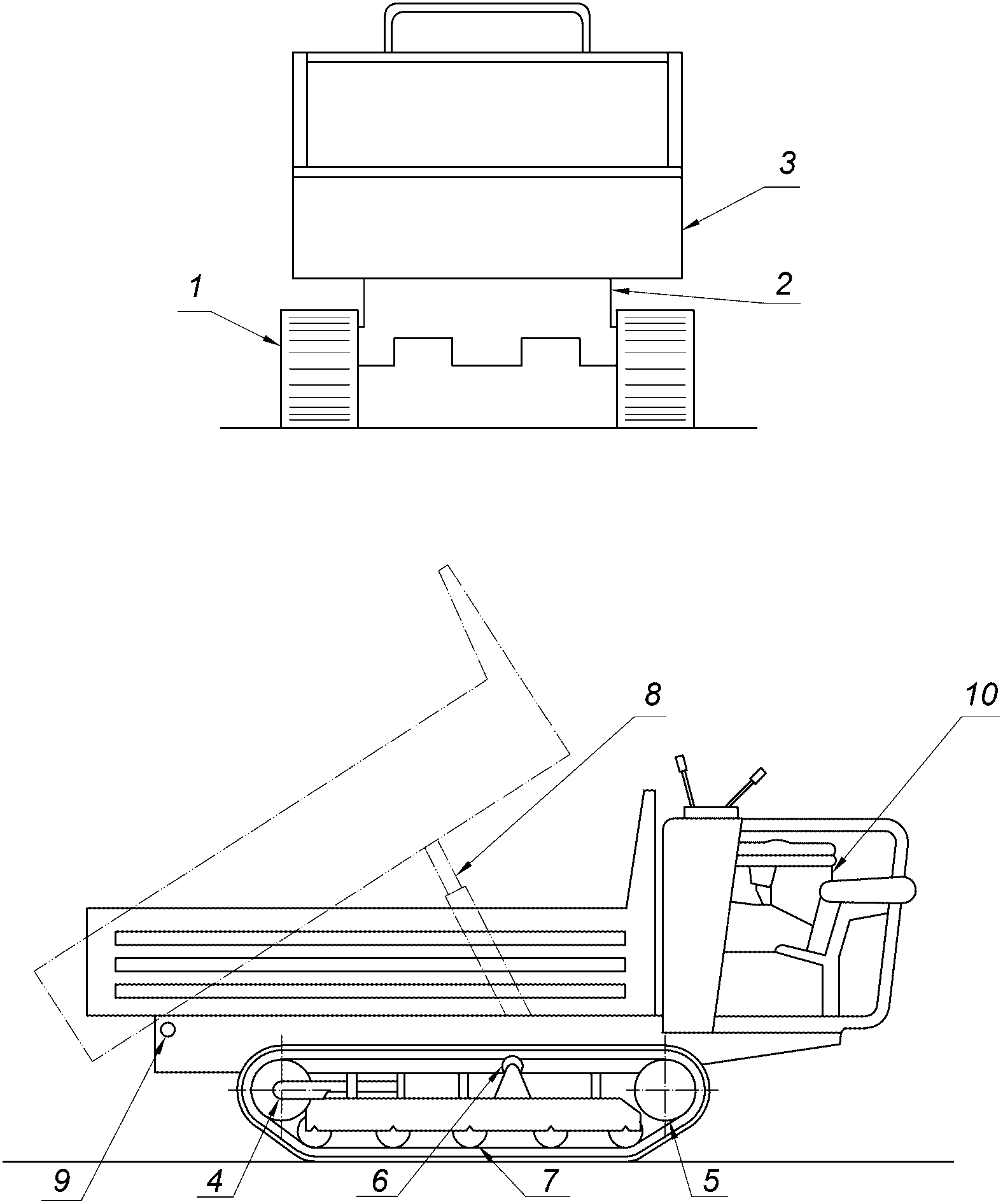 3.1.4 оборудование для самозагрузки (self-loading equipment): Смонтированное на мини-самосвале ковшовое оборудование с независимым приводом, предназначенное для загрузки материала в открытый кузов.