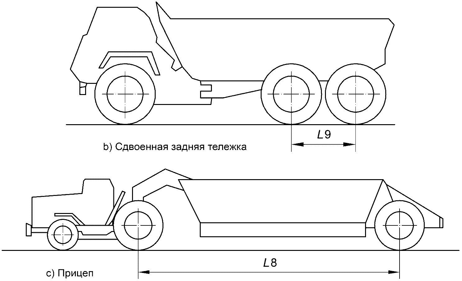 L8 | Колесная база прицепа: Расстояние по координате X между двумя плоскостями X, проходящими через центры задних колес тягача и задними колесами прицепа. Для машин со сдвоенной задней тележкой за центр колес принимают линию, проходящую посередине расстояния между двумя осями колес сдвоенной тележки | |