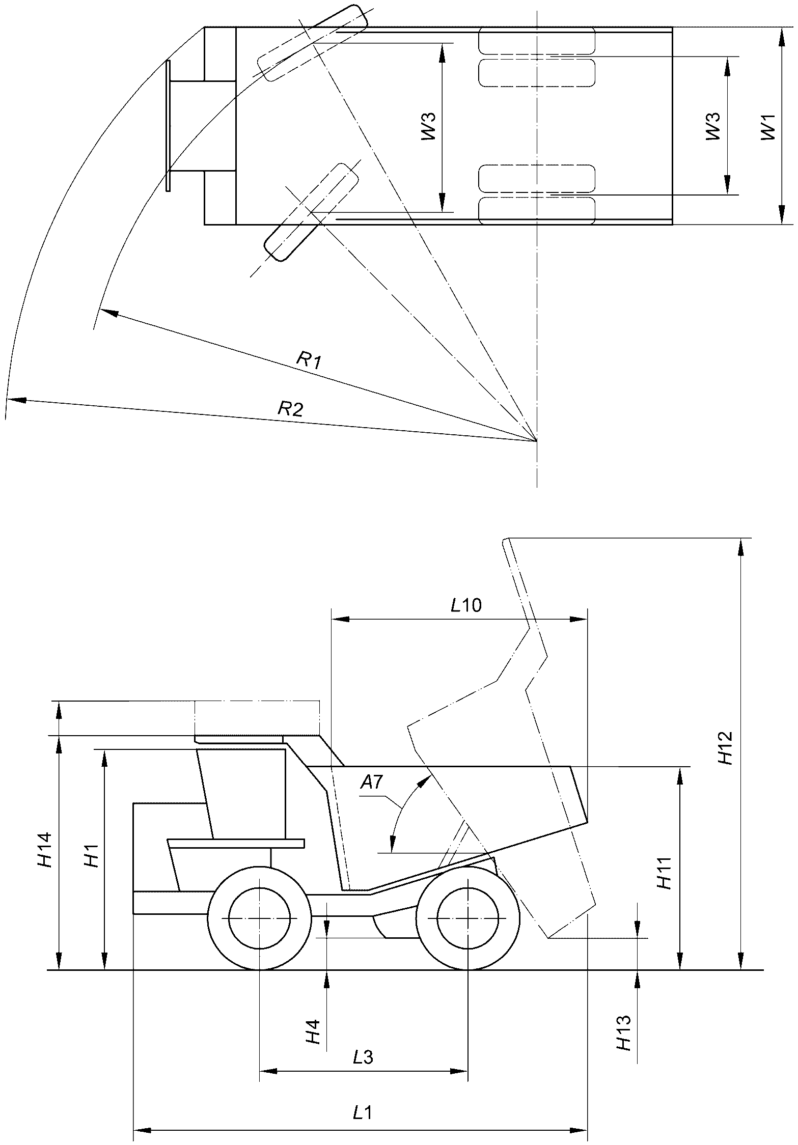 H14 | Максимальная высота кузова самосвала или сцепного устройства: Расстояние по координате Z от GRP до верхней точки кузова или сцепного устройства при установке незагруженного кузова в положение загрузки с устройством защиты от просыпающегося материала, если самосвал оборудован этим устройством | |