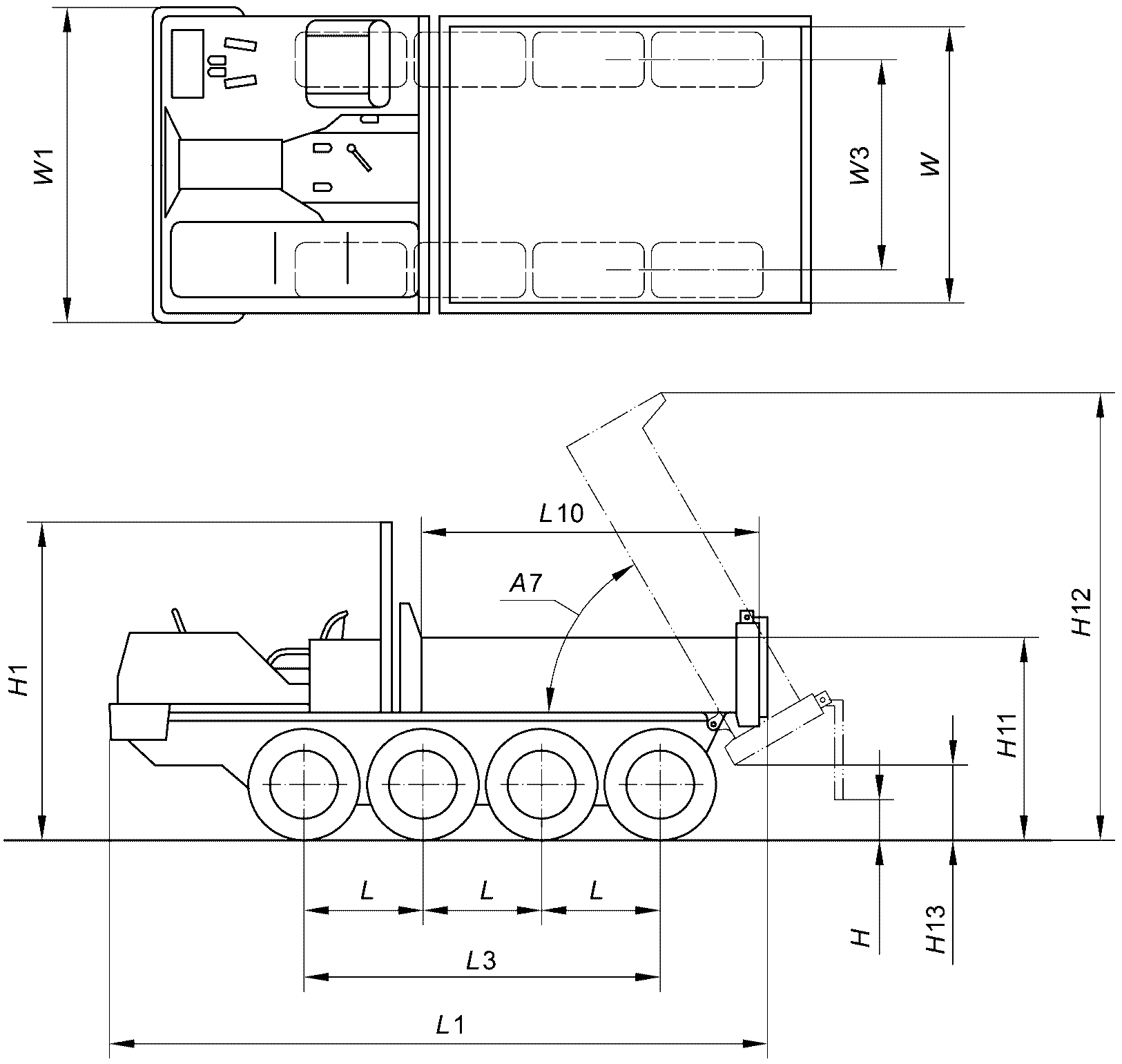 L14 | Дистанция разгрузки: Расстояние по координате X между внешней поверхностью передних колес и передним краем кузова, поднятом в крайнее верхнее положение | |