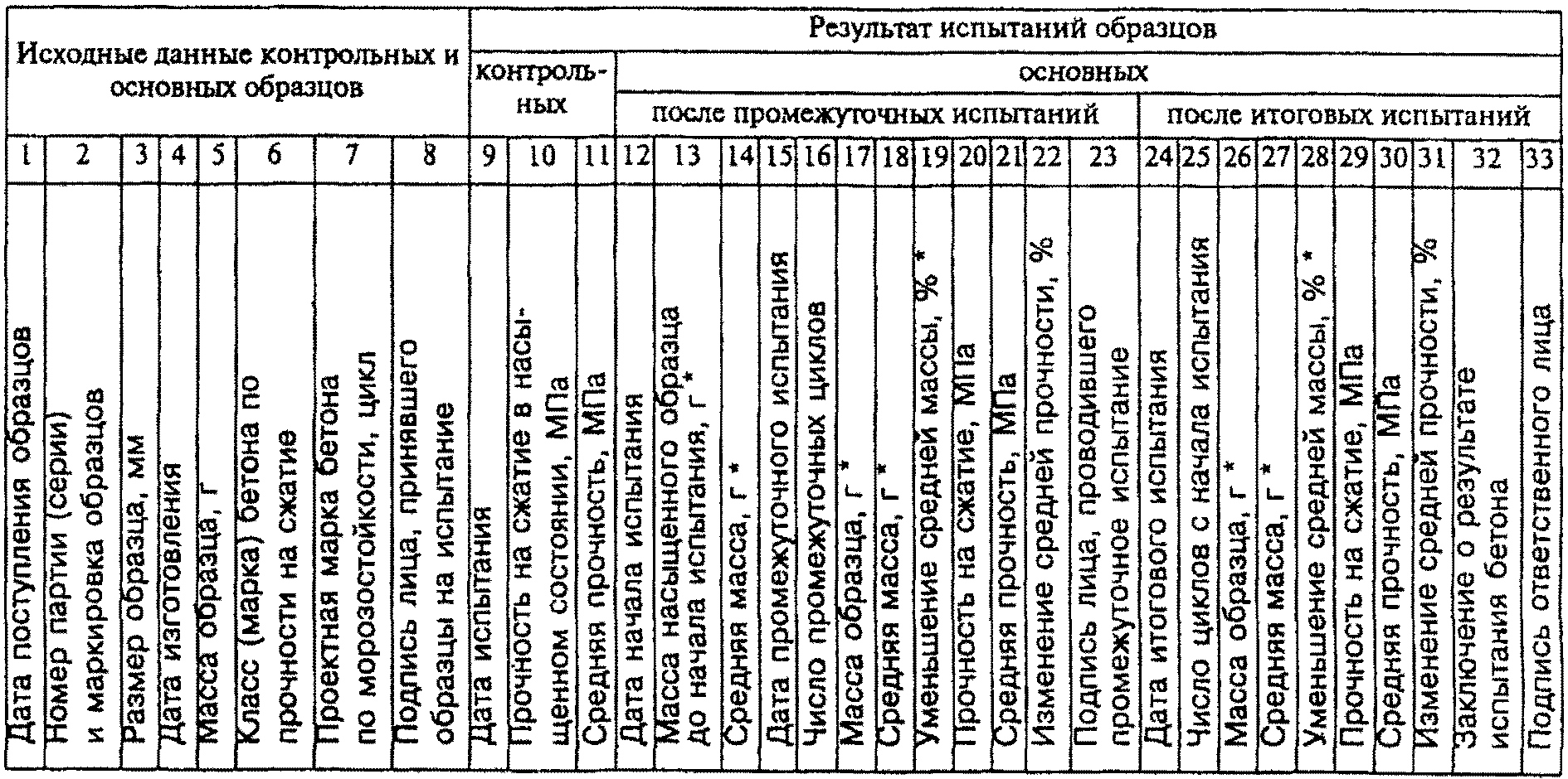 ФОРМА ЖУРНАЛА ИСПЫТАНИЯ БЕТОНА НА МОРОЗОСТОЙКОСТЬ