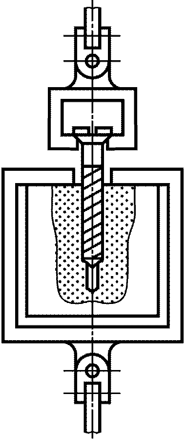 5.1. Испытательный блок устанавливают в захватах приспособления на испытательной машине так, чтобы ось шурупа (гвоздя) совпадала с осью приспособления (см.