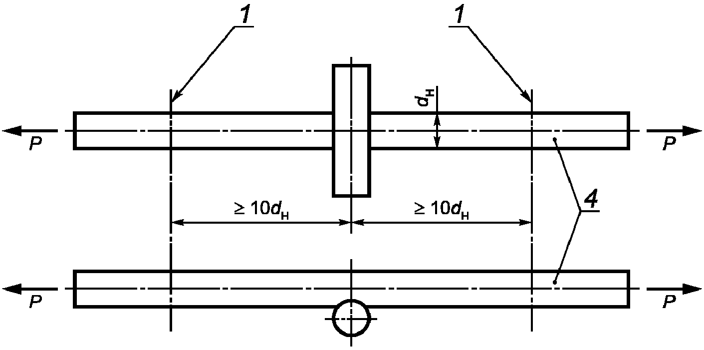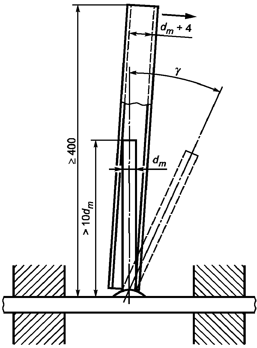 - при диаметре рабочего стержня более 12 мм. Поперечный стержень (меньшего диаметра) при испытаниях на изгиб должен располагаться в зоне максимального изгибающего момента (см. рисунок И.1). Испытания на изгиб образцов тавровых соединений стержней с пластинами проводят вручную с помощью трубы, надеваемой на приваренный отрезок арматурного стержня (см.