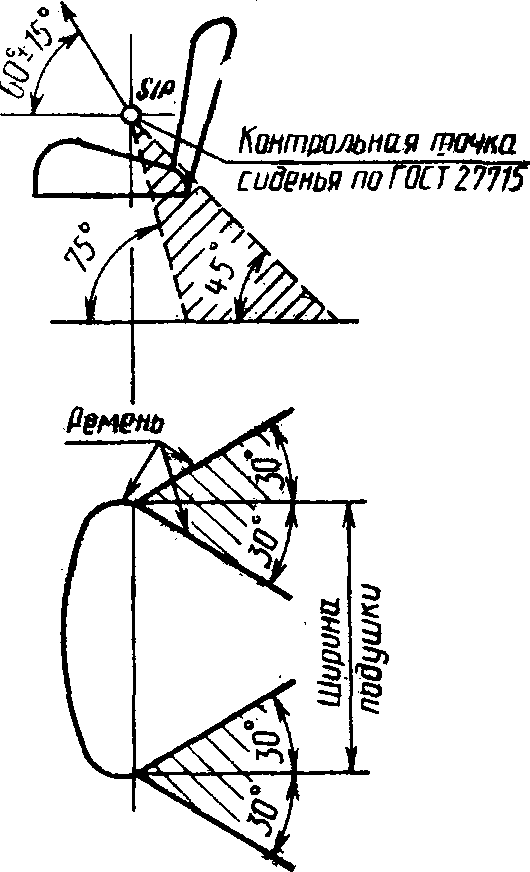 Если сиденье оператора без подвески, то комплект ремня безопасности допускается крепить к сиденью или к машине в любой точке заштрихованных зон, как указано на чертеже. Положение контрольной точки сиденья (точка SIP) определяют по