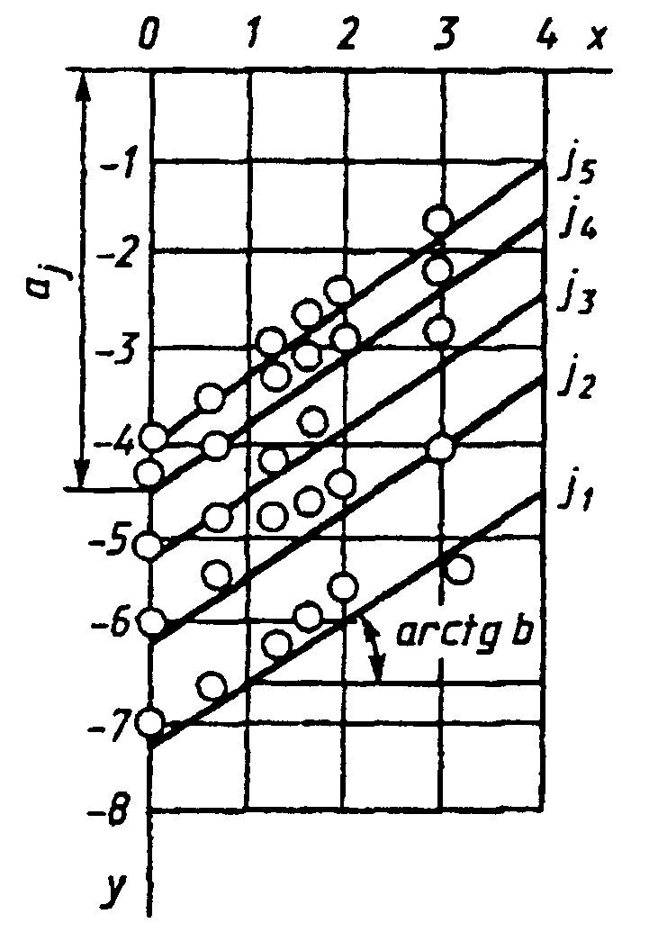 - в масштабе чертежа равен отрезку, отсекаемому на оси ординат (y) j-й из семейства параллельных прямых наилучшего приближения к экспериментальным точкам;