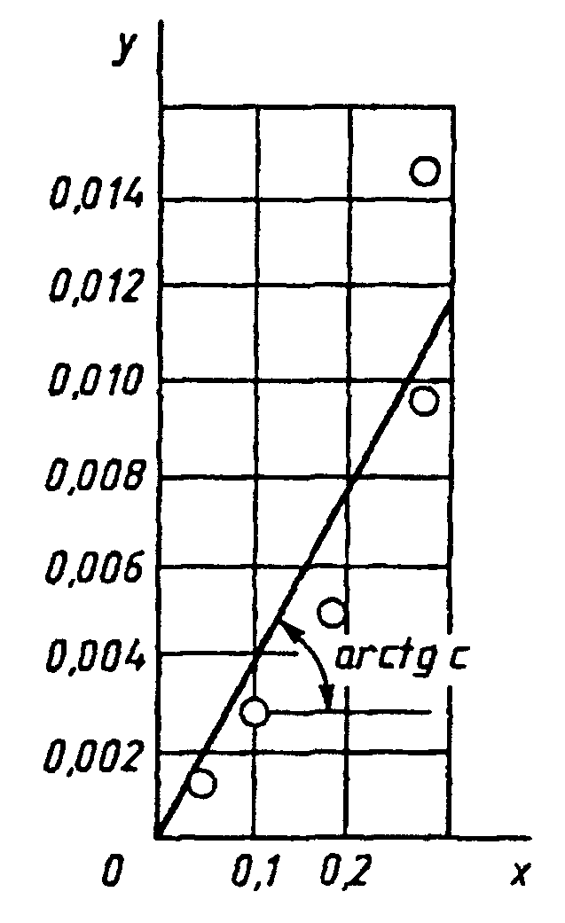 рисунок Ш.3), при этом c в масштабе чертежа равен тангенсу угла наклона к оси абсцисс (x) прямой наилучшего приближения к экспериментальным точкам, проходящей через начало координат.