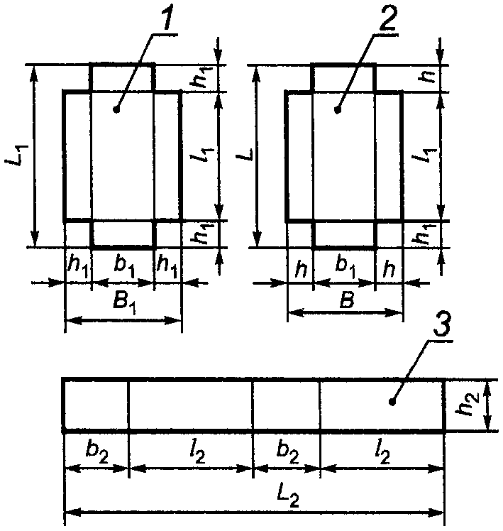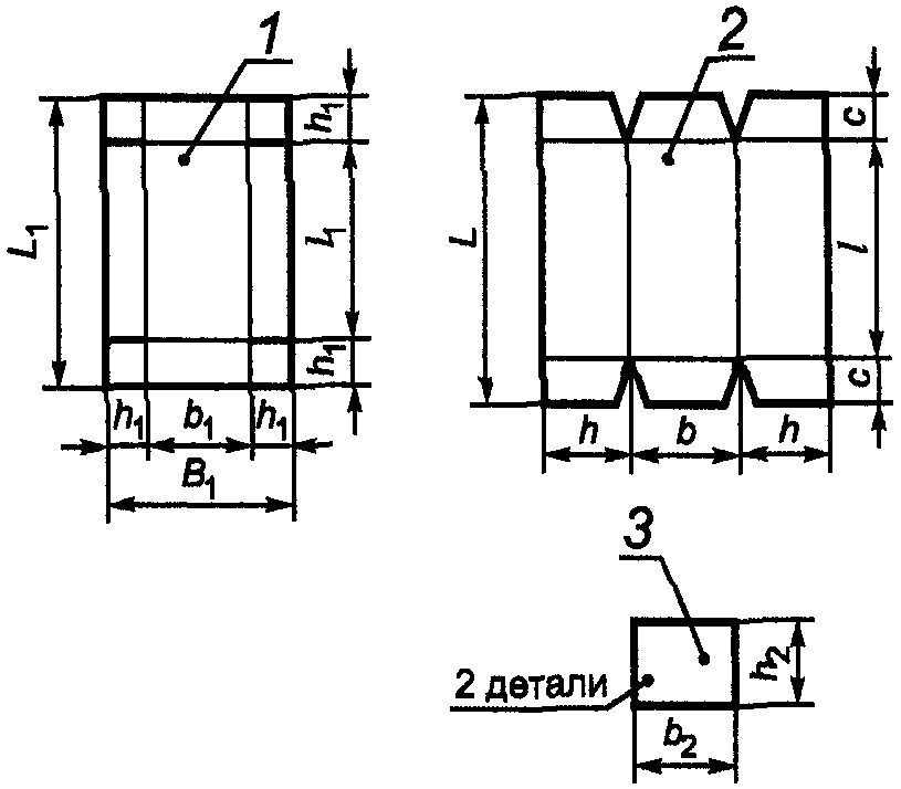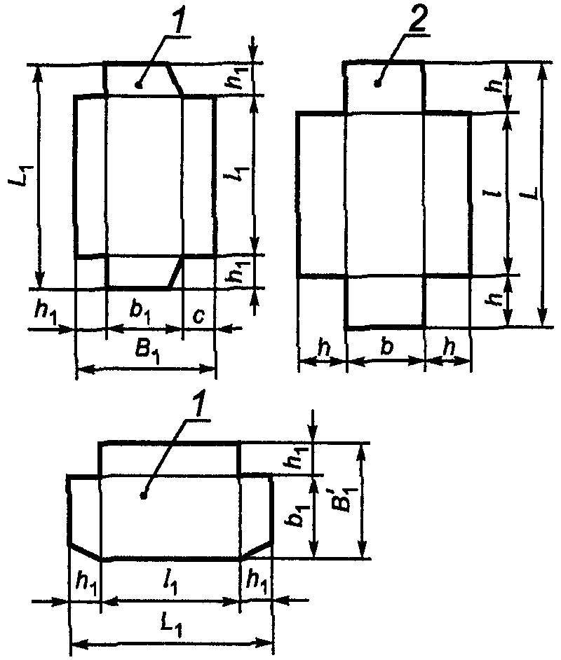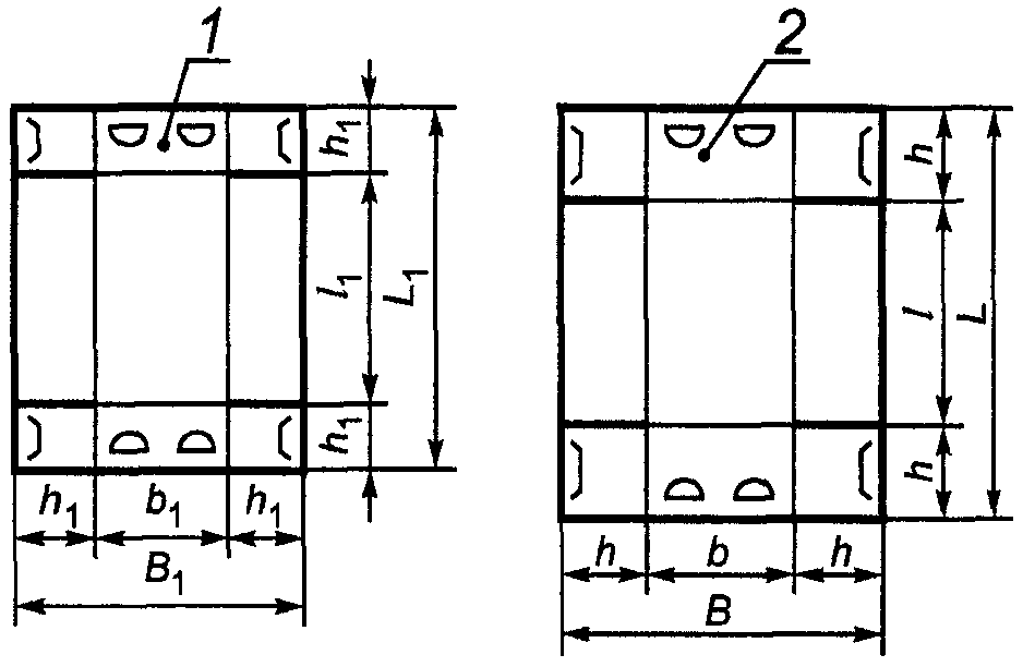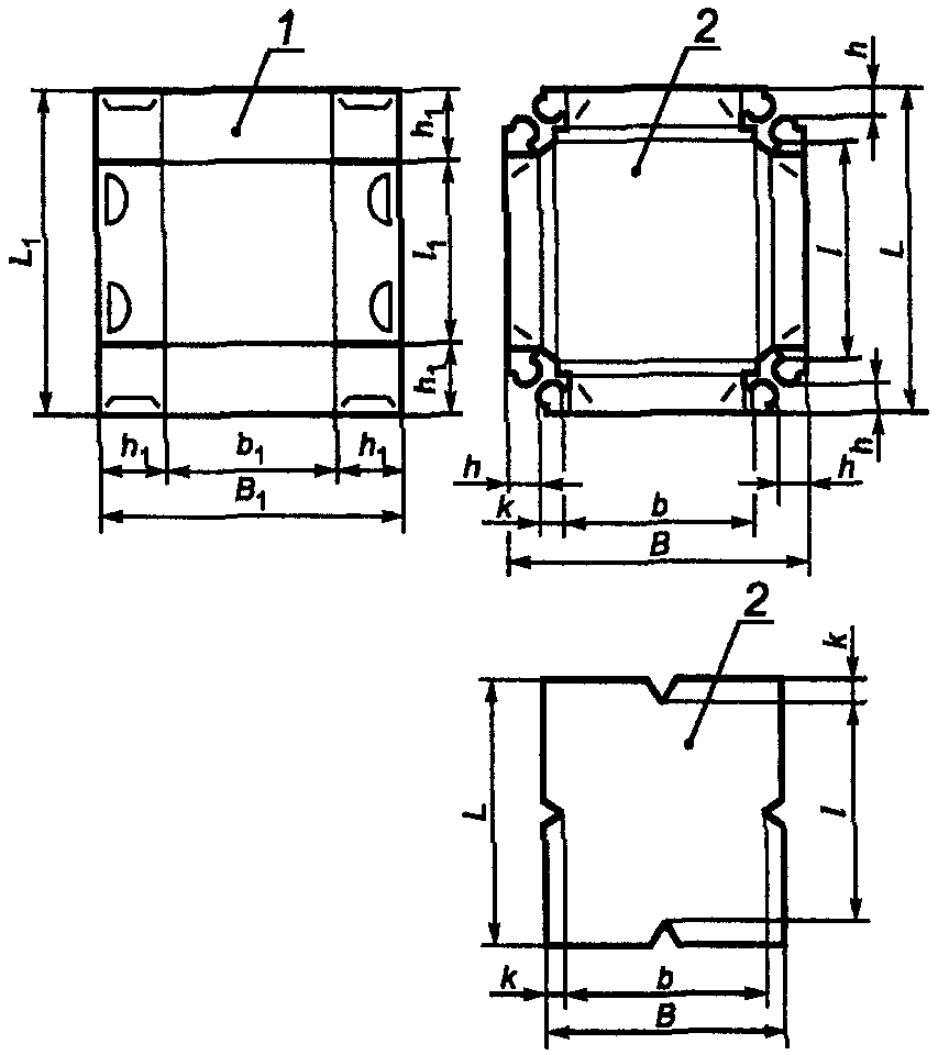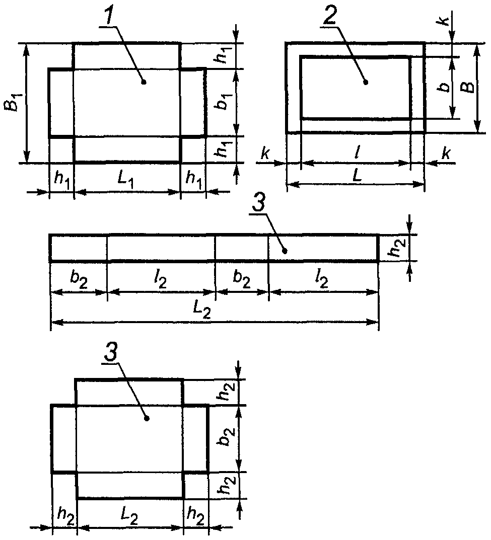 Примечания 1. Условные обозначения деталей коробок на рисунках 1 - 23, принятые в таблице А.1: 1 - крышка; 2 - корпус; 3 - элемент корпуса. 2. Условные обозначения размеров на рисунках 1 - 23: |