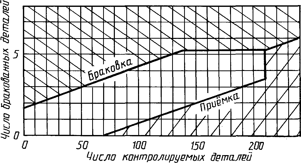 Результаты отражаются в движении точки по диаграмме. Исходное ее положение - в начале координат (нуль). При каждом испытании точка сдвигается на одну единицу параллельно оси X. При каждом неудовлетворительном испытании она также сдвигается на одну единицу параллельно оси Y. Испытания прекращают, как только точка достигнет одной из областей, обозначенных: "приемка" или "браковка".