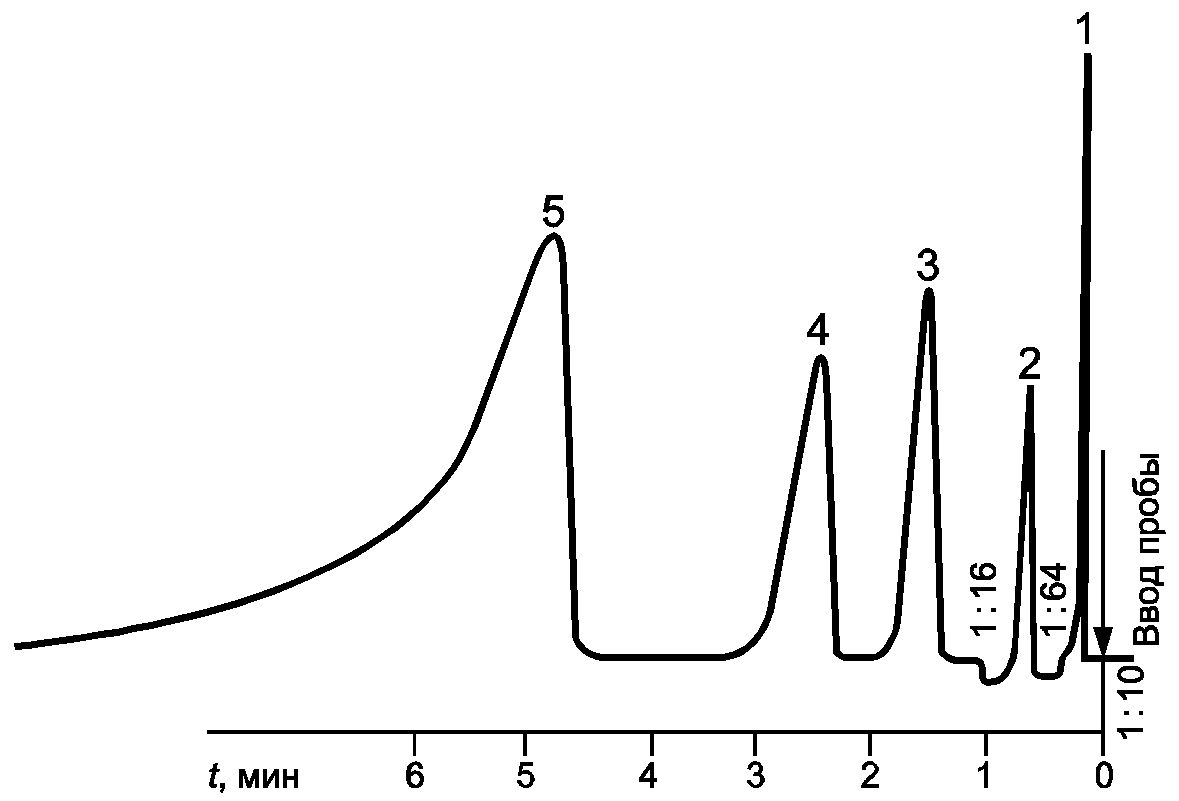 Затем исходный растворитель и градуировочные растворы хроматографируют пять раз в условиях проведения анализа (