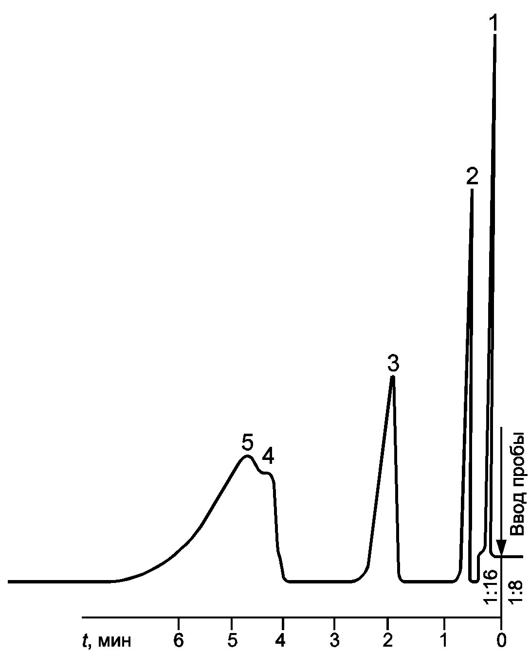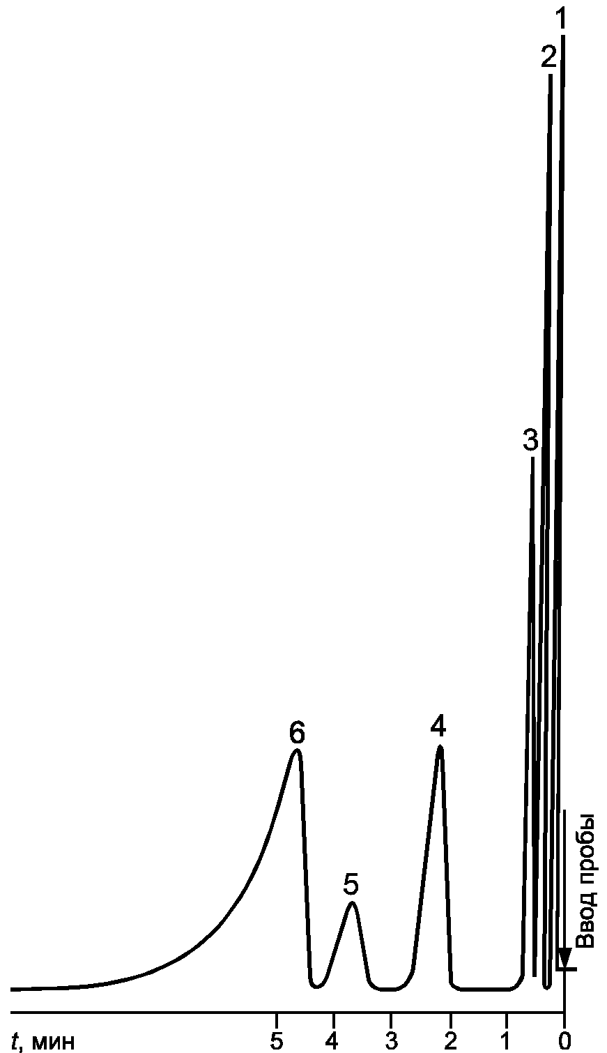 Снимают две хроматограммы испытуемого растворителя. Условия анализа испытуемого растворителя должны соответствовать условиям, приведенным в