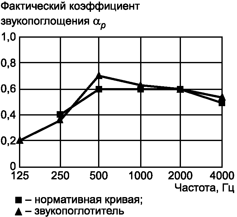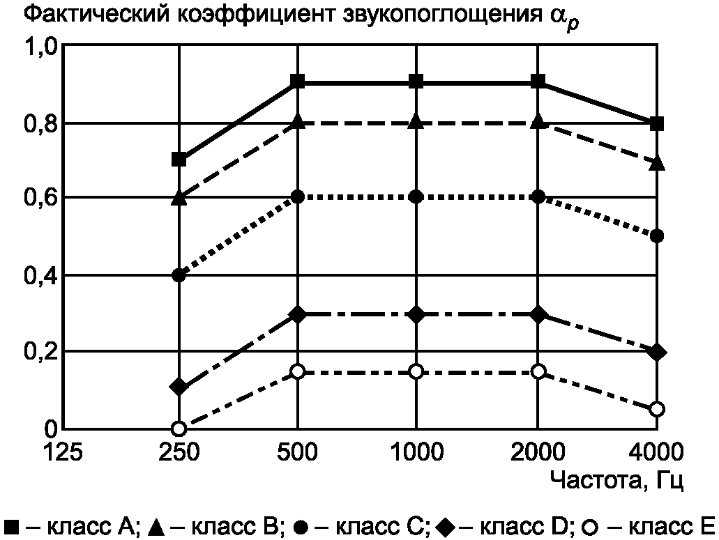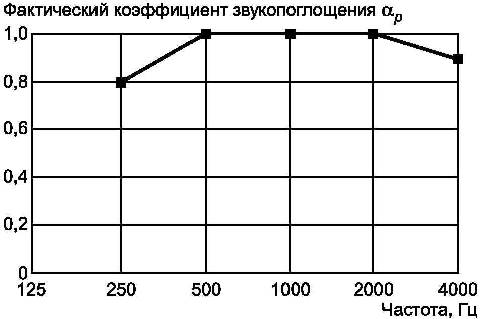 : Частотно-зависимые значения коэффициентов звукопоглощения, измеренные в 1/3-октавных полосах частот и пересчитанные в значения коэффициентов в октавных полосах частот.