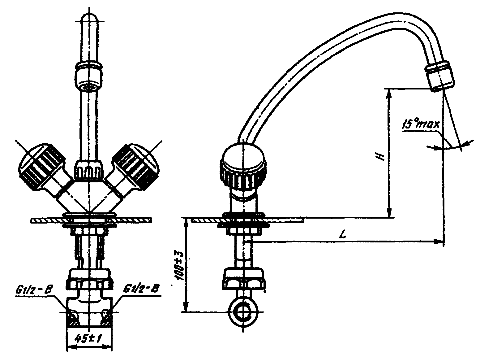3.7. Центральные смесители для умывальников, моек изготовляют с литым тройником или с гибкими трубками, предназначенными для присоединения смесителя к сетям холодной и горячей воды, основные размеры которых указаны на