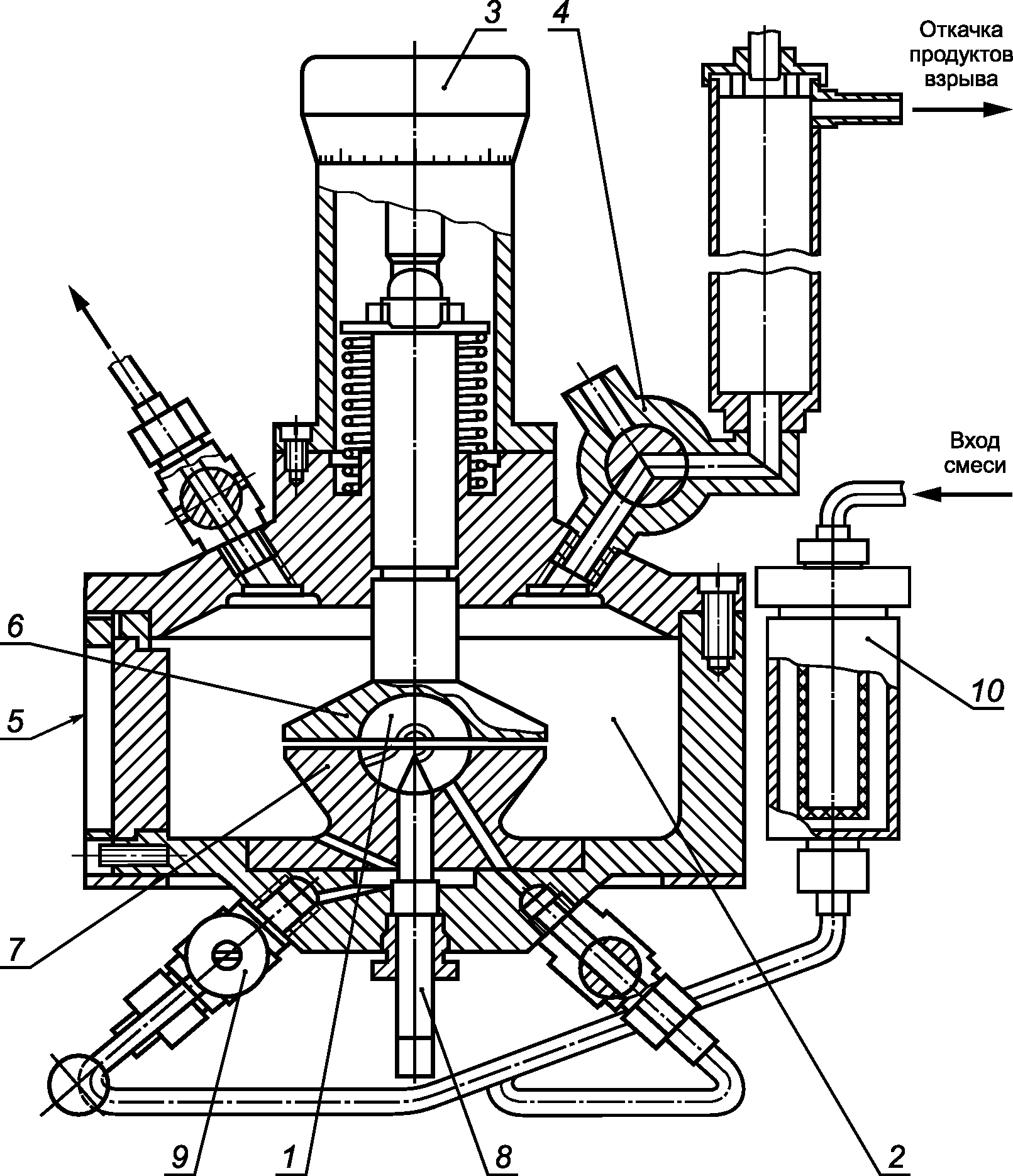 После приготовления (заполнения) смеси горючего с воздухом в камерах ее поджигают искровым электрическим разрядом. О наличии взрыва во внутренней камере судят по специальному датчику. Через смотровое окно наблюдают за результатом испытаний. Если взрыв из внутренней камеры передается через фланцевый зазор во внешнюю камеру и воспламеняет окружающую взрывоопасную смесь, считают, что произошла "передача взрыва"; если взрыв из внутренней камеры не передается через зазор в окружающую среду, то фиксируют "непередачу взрыва". При "непередаче взрыва" смесь поджигают искрой от запальной свечи во внешней камере. После испытания камеры продувают воздухом.