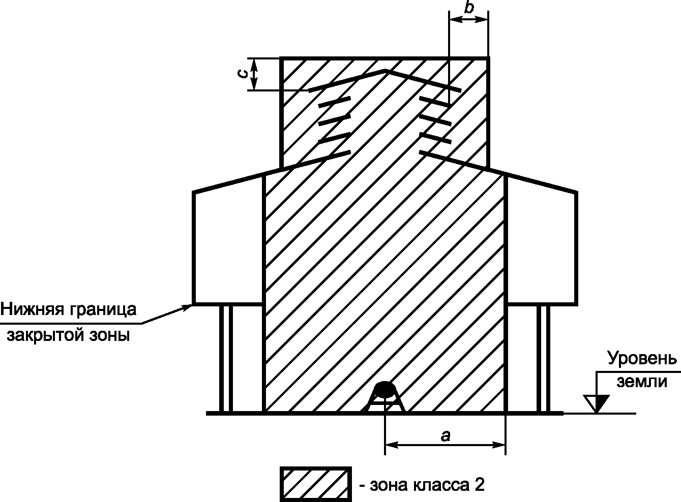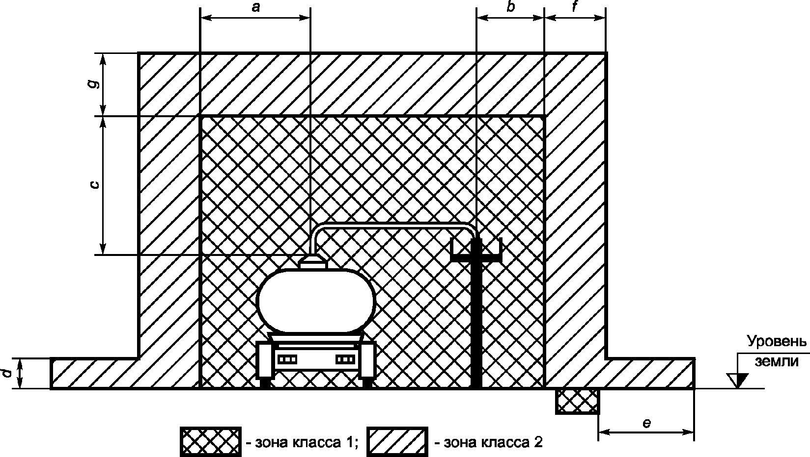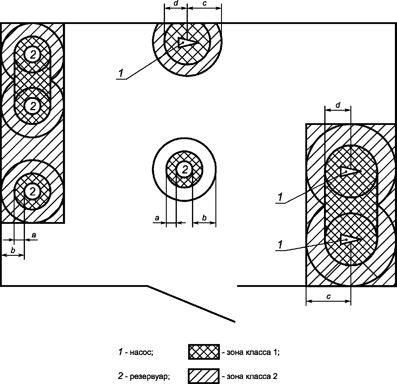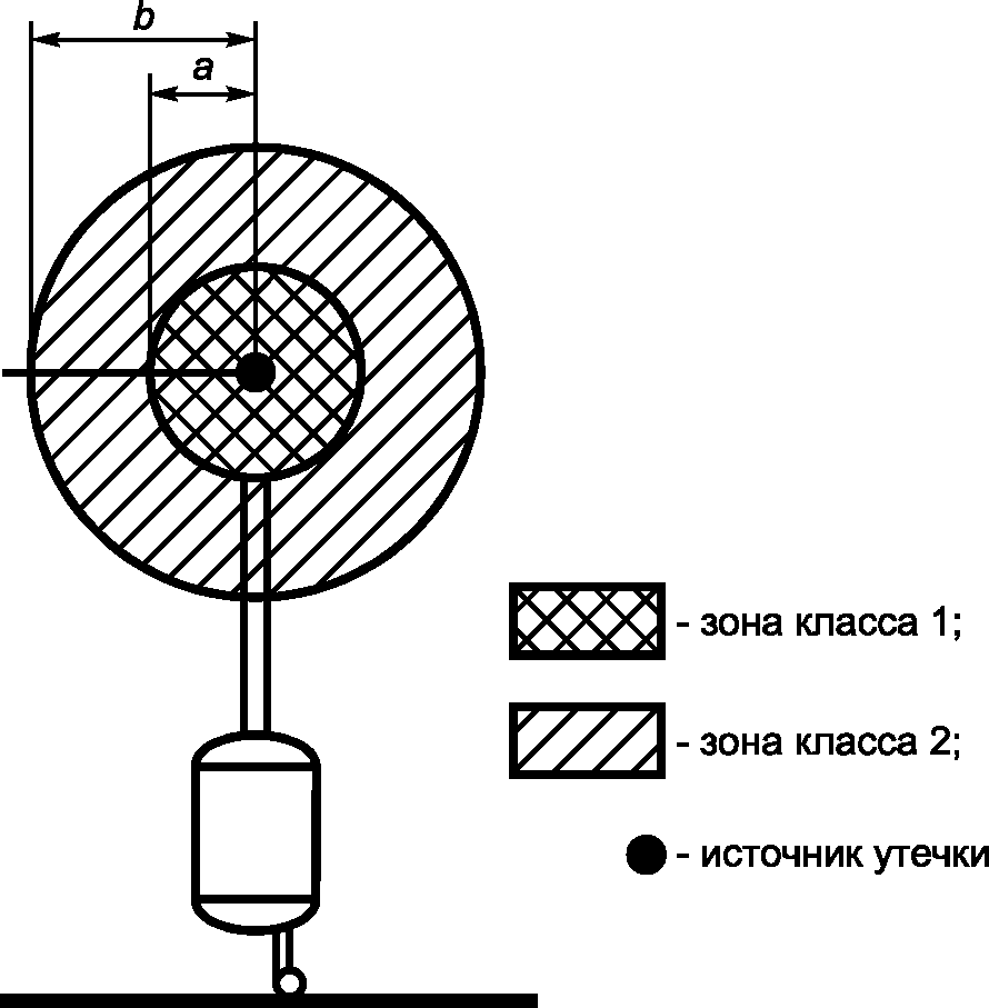 Примечание. Для закрытой системы с улавливанием пара расстояния могут быть уменьшены таким образом, что размеры взрывоопасной зоны класса 1 становятся пренебрежимо малыми, а размеры зоны класса 2 значительно уменьшаются.