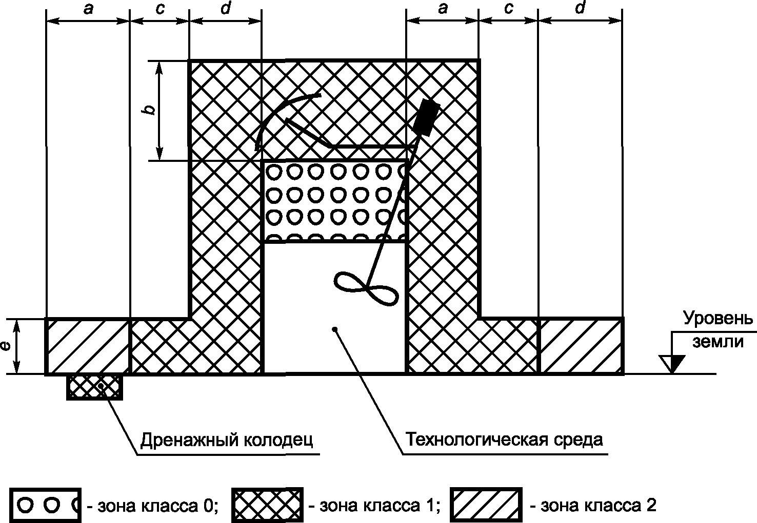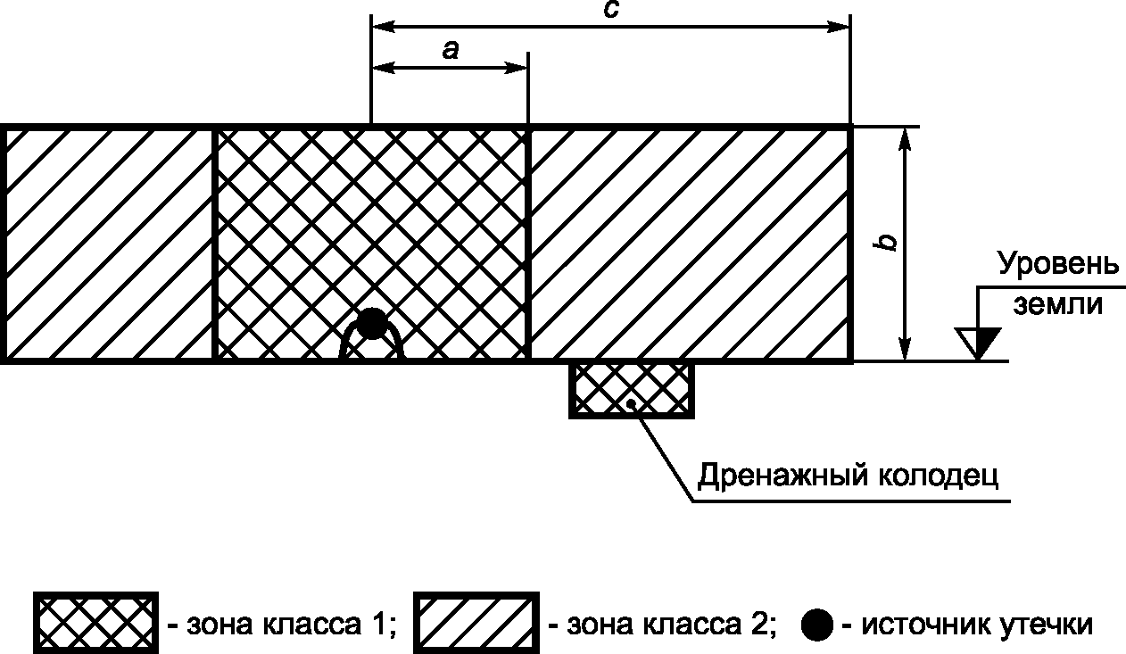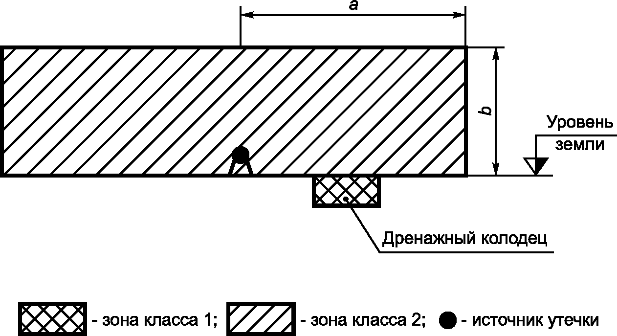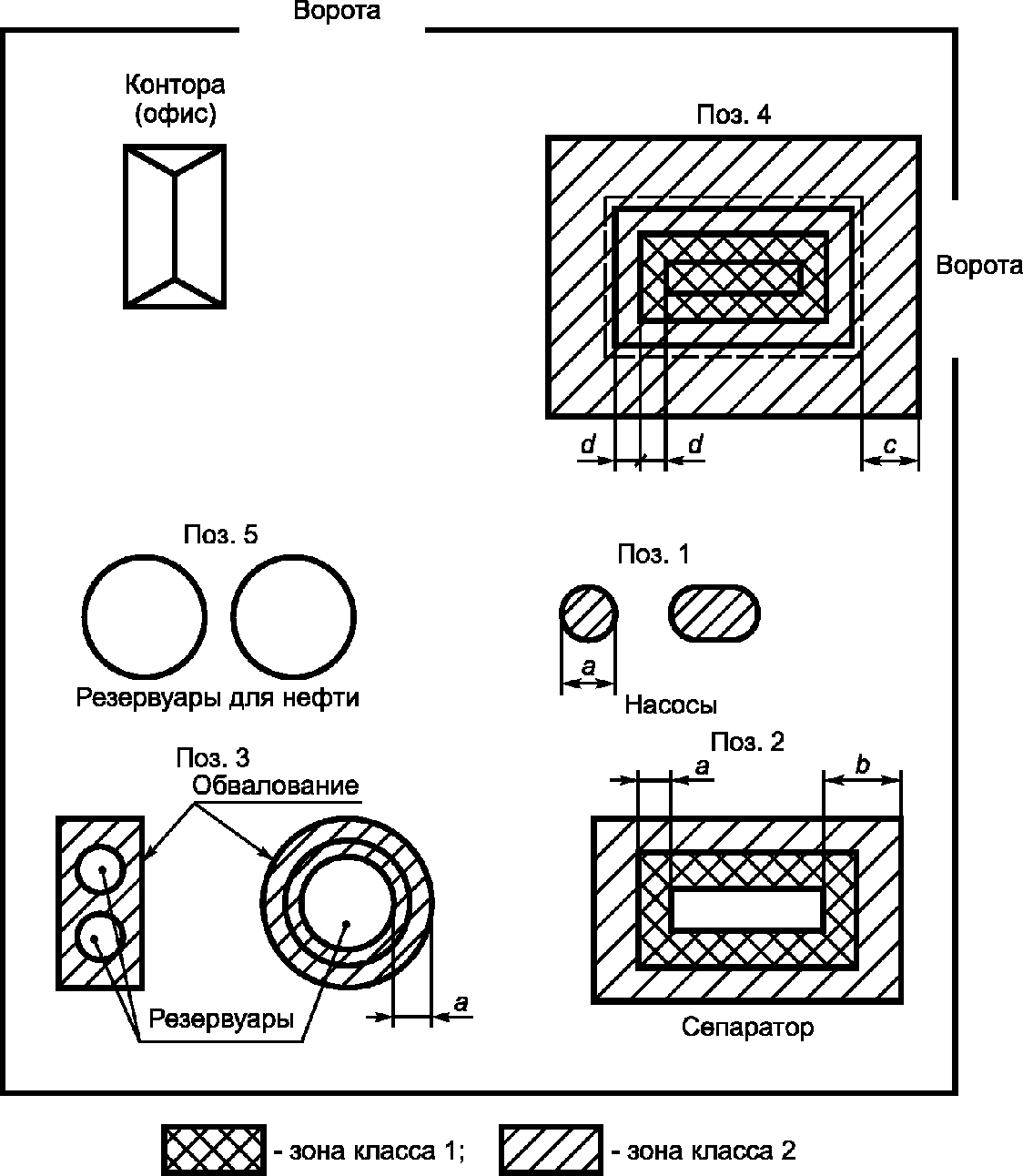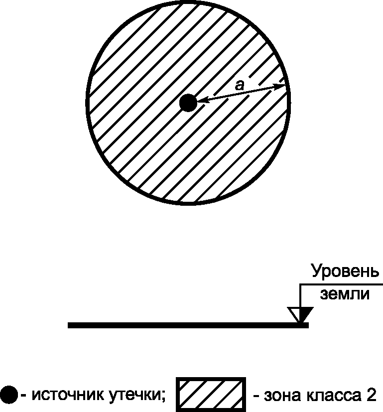 Примечание. Для правильного определения взрывоопасности зон внутри резервуаров и в сепараторе (зона класса 0), а также зон вокруг выпускных отверстий резервуаров (зона класса 1) следует использовать