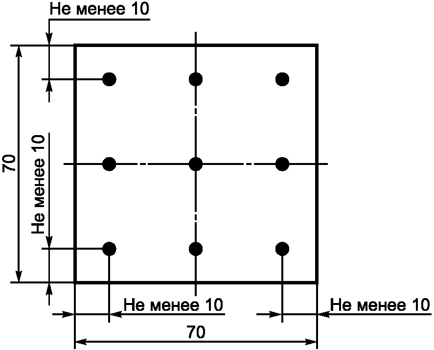 7.11.2.6. Для определения истираемости по глубине износа тщательно очищенный образец перед проведением испытаний устанавливают истираемой гранью вверх на ровную горизонтальную поверхность и измеряют индикатором толщину в девяти точках (см. рисунок 1) с погрешностью не более 0,01 мм.
