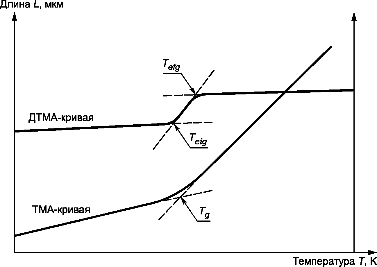 7.6.5.1. Температуру стеклования определяют как точку пересечения касательных к ТМА-кривой до и после стеклования (см. рисунок 7.3).