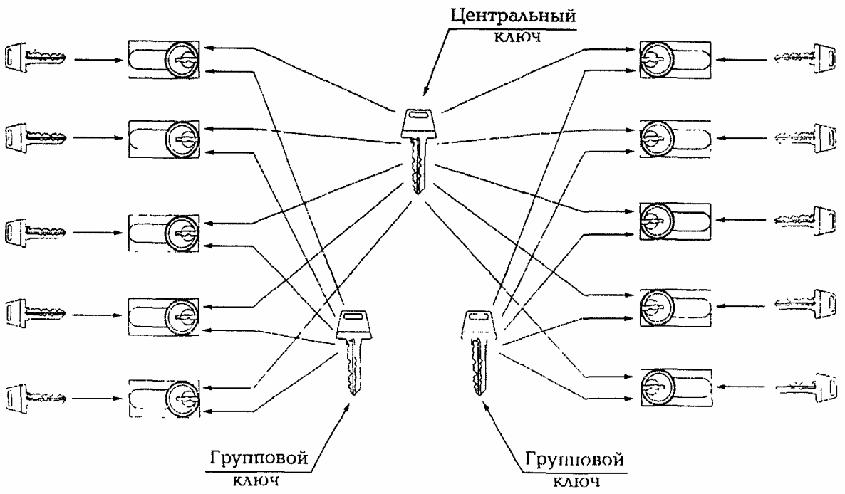 - на каждой из бородок ключа допускается не более одной пары с одинаковыми уровнями, включая и уровень перемещающего засов;