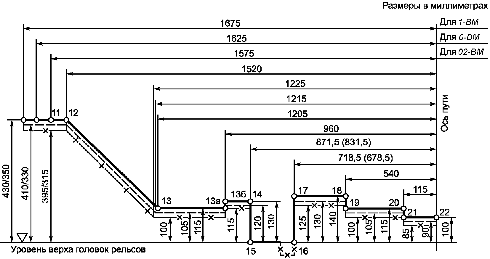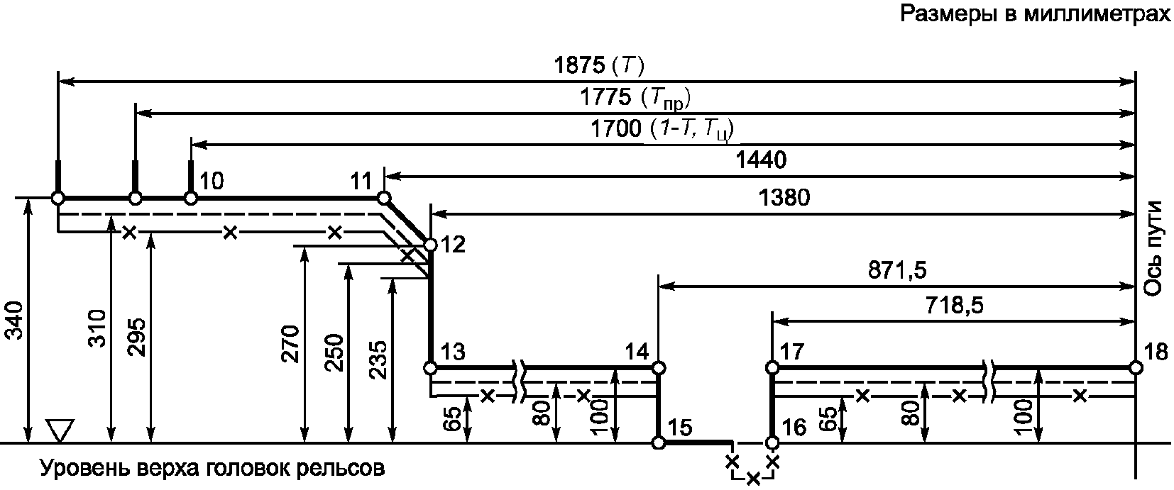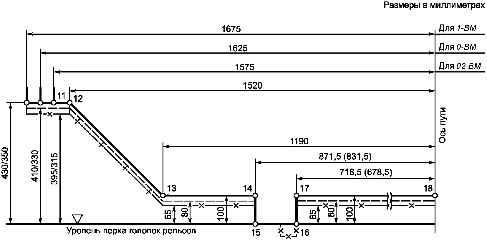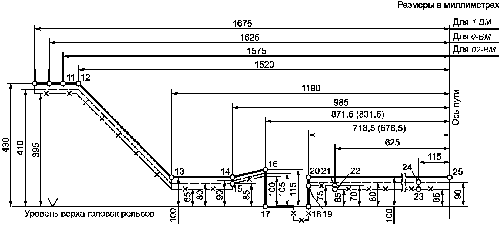 должны соответствовать указанным на рисунках 9 - 14. При этом габарит 1-BM, приведенный на рисунке 10, допускается увеличивать за счет дополнительной наклонной линии, имеющей расстояние от оси пути: 1700 мм - на высоте 3850 мм (точка 4); 1800 мм - на высоте 1160 мм (точка 9), для вписывания в габарит выступающих частей (поручни, подлокотники, козырьки для стока воды, параваны и др.) для подвижного состава, предназначенного к эксплуатации в пределах только железных дорог колеи 1520 (1524) мм.