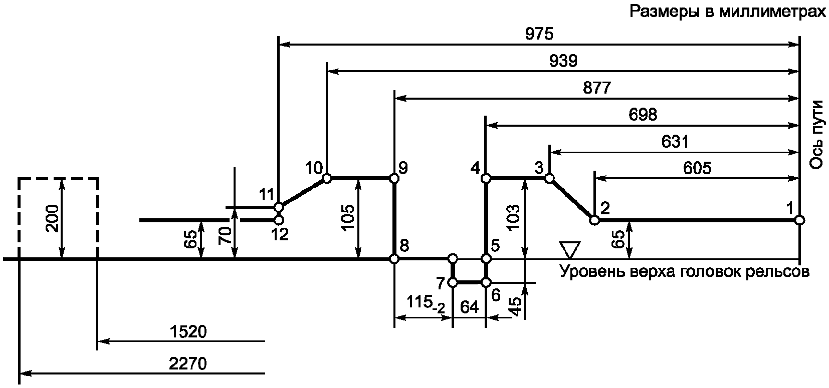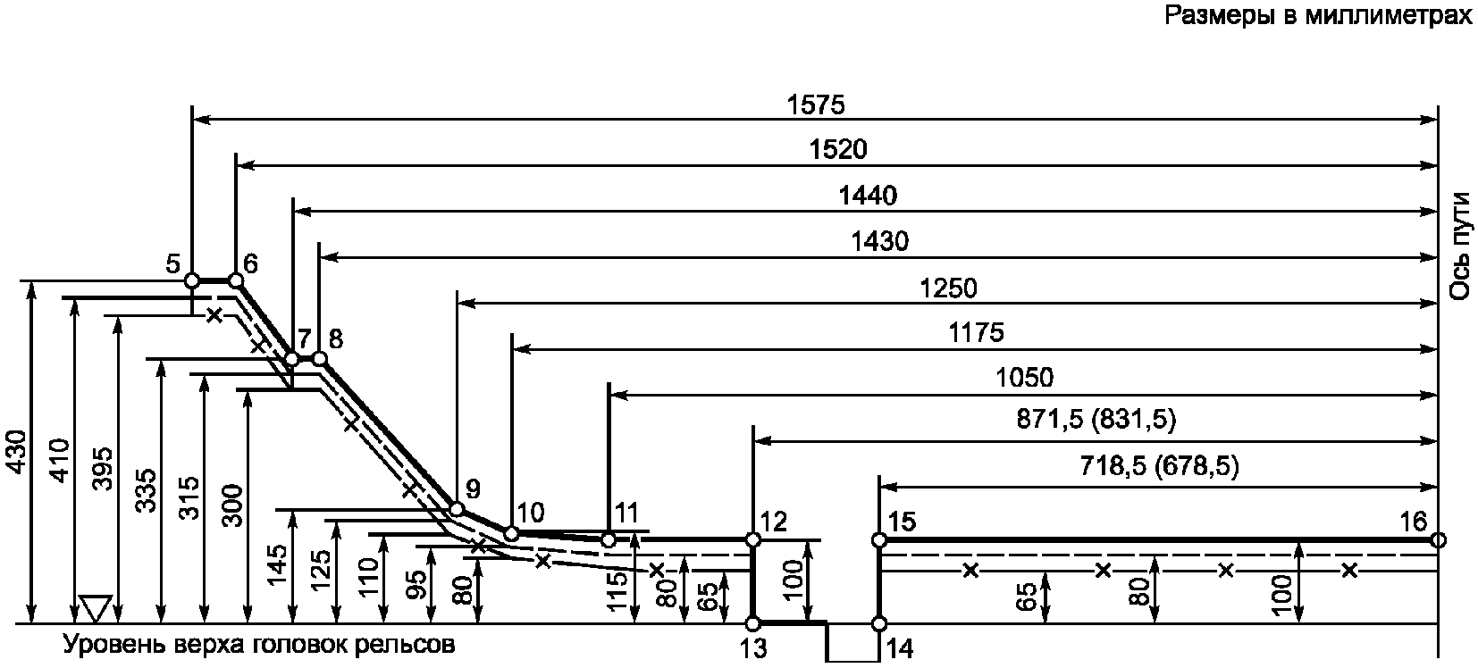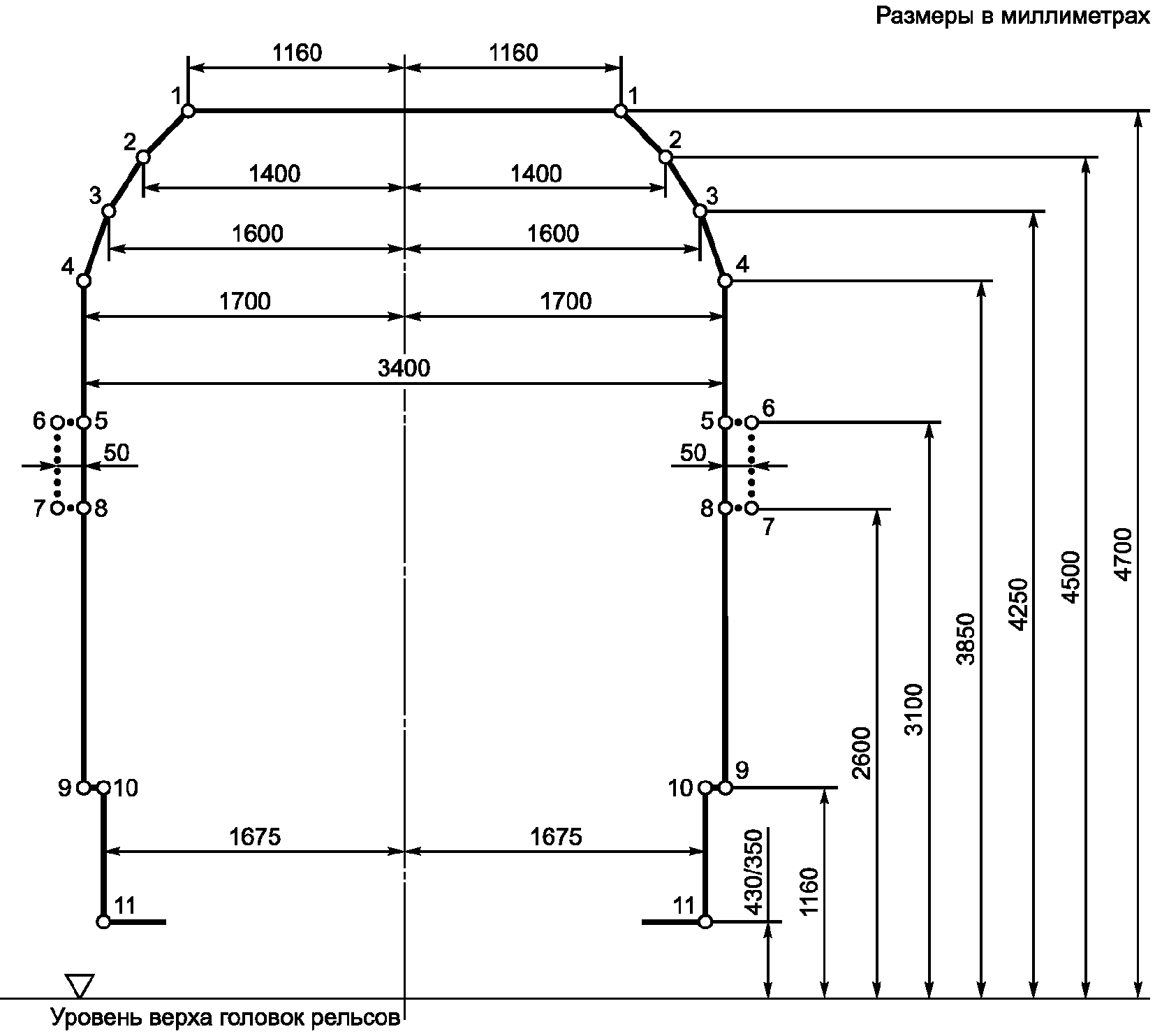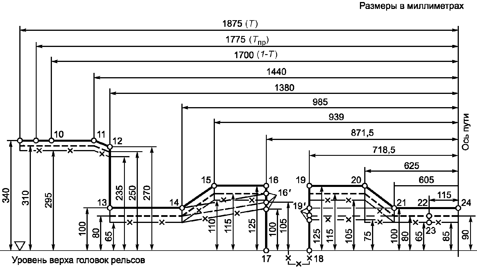 должны соответствовать указанным на рисунках 9 - 14. При этом габарит 1-BM, приведенный на рисунке 10, допускается увеличивать за счет дополнительной наклонной линии, имеющей расстояние от оси пути: 1700 мм - на высоте 3850 мм (точка 4); 1800 мм - на высоте 1160 мм (точка 9), для вписывания в габарит выступающих частей (поручни, подлокотники, козырьки для стока воды, параваны и др.) для подвижного состава, предназначенного к эксплуатации в пределах только железных дорог колеи 1520 (1524) мм.