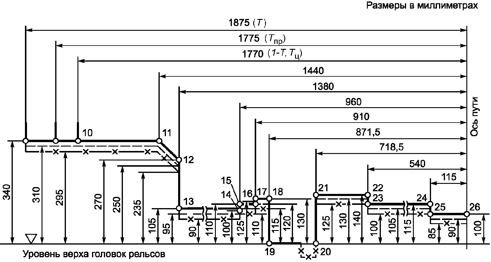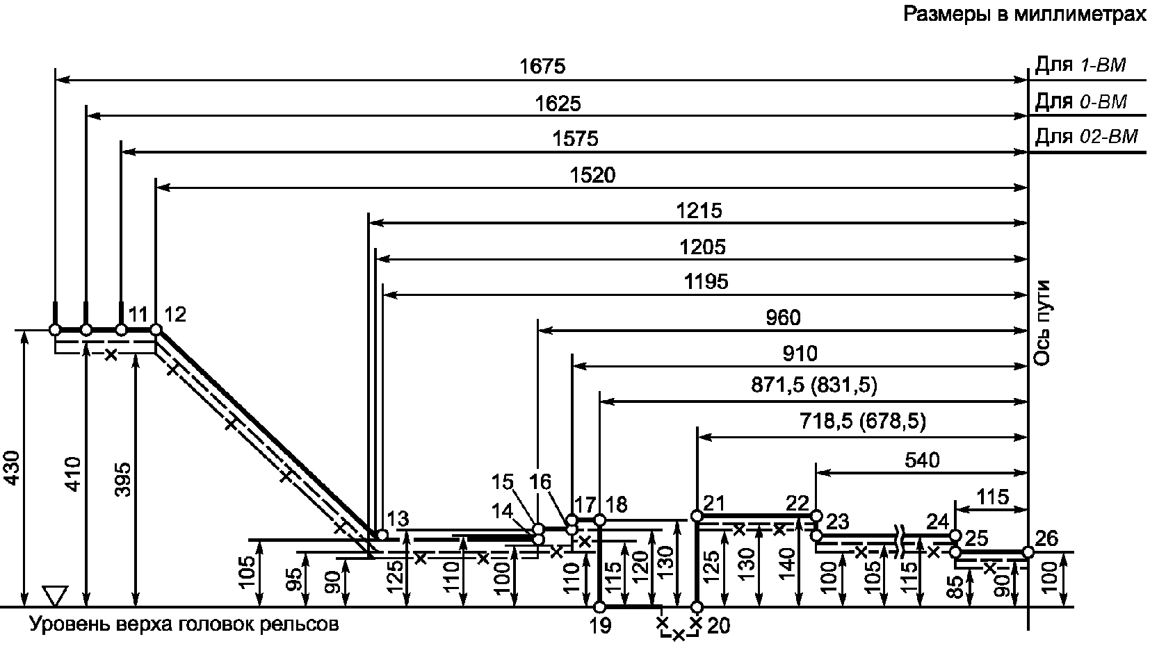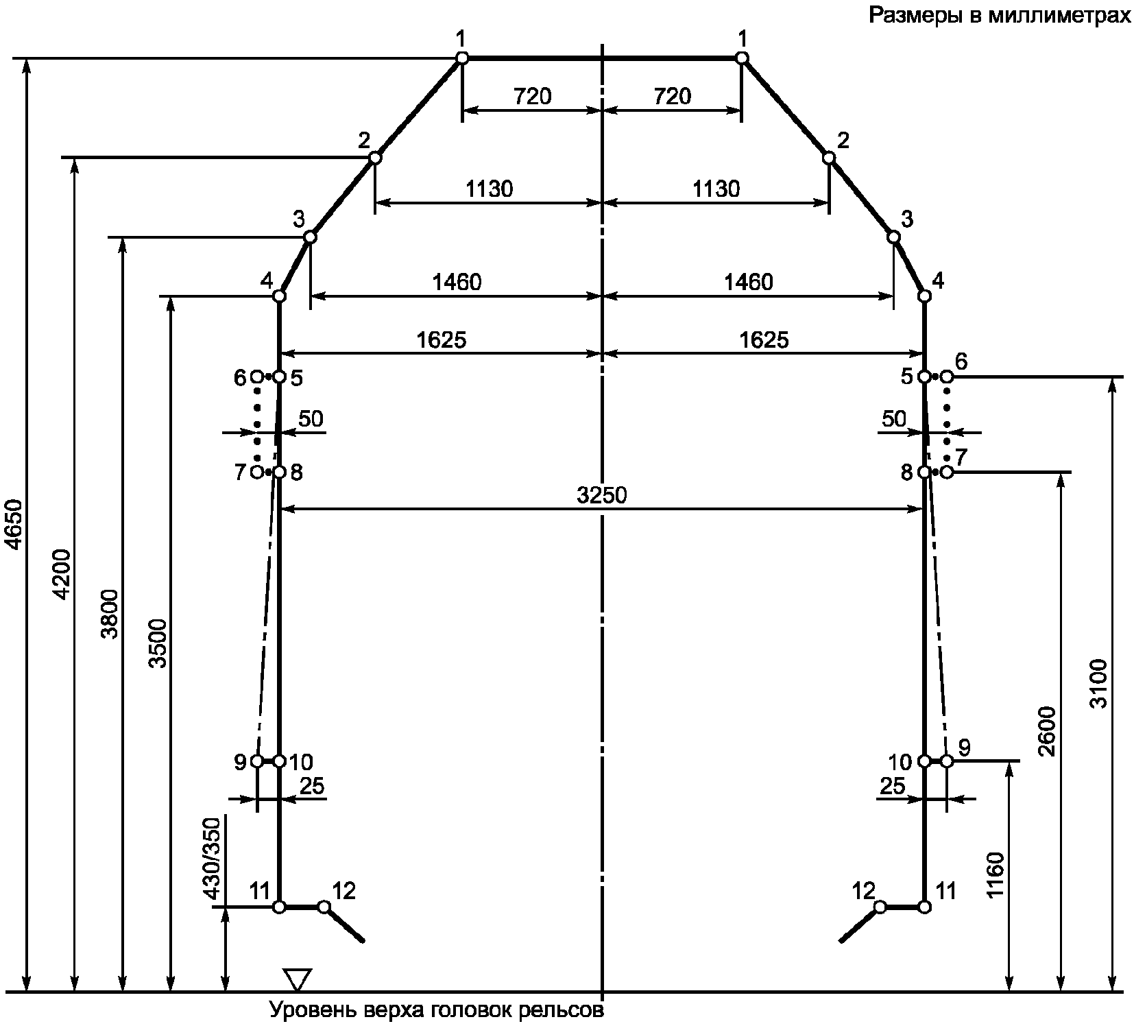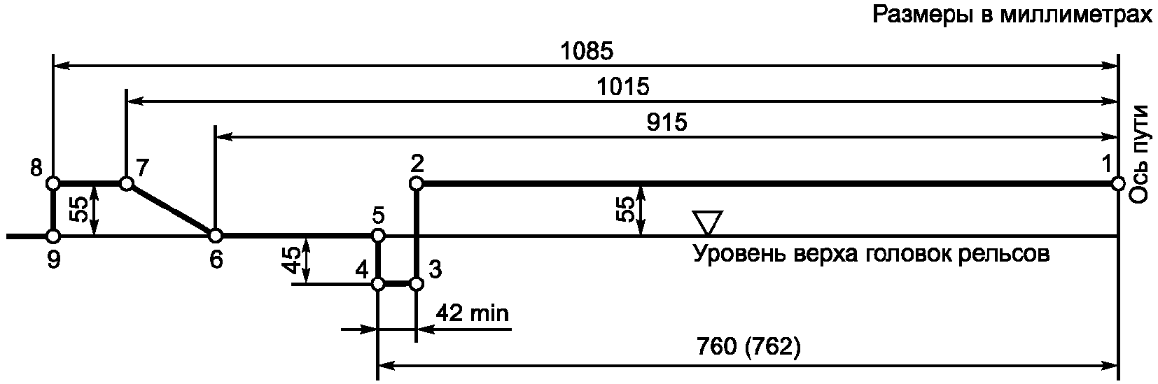 должны соответствовать указанным на рисунках 9 - 14. При этом габарит 1-BM, приведенный на рисунке 10, допускается увеличивать за счет дополнительной наклонной линии, имеющей расстояние от оси пути: 1700 мм - на высоте 3850 мм (точка 4); 1800 мм - на высоте 1160 мм (точка 9), для вписывания в габарит выступающих частей (поручни, подлокотники, козырьки для стока воды, параваны и др.) для подвижного состава, предназначенного к эксплуатации в пределах только железных дорог колеи 1520 (1524) мм.