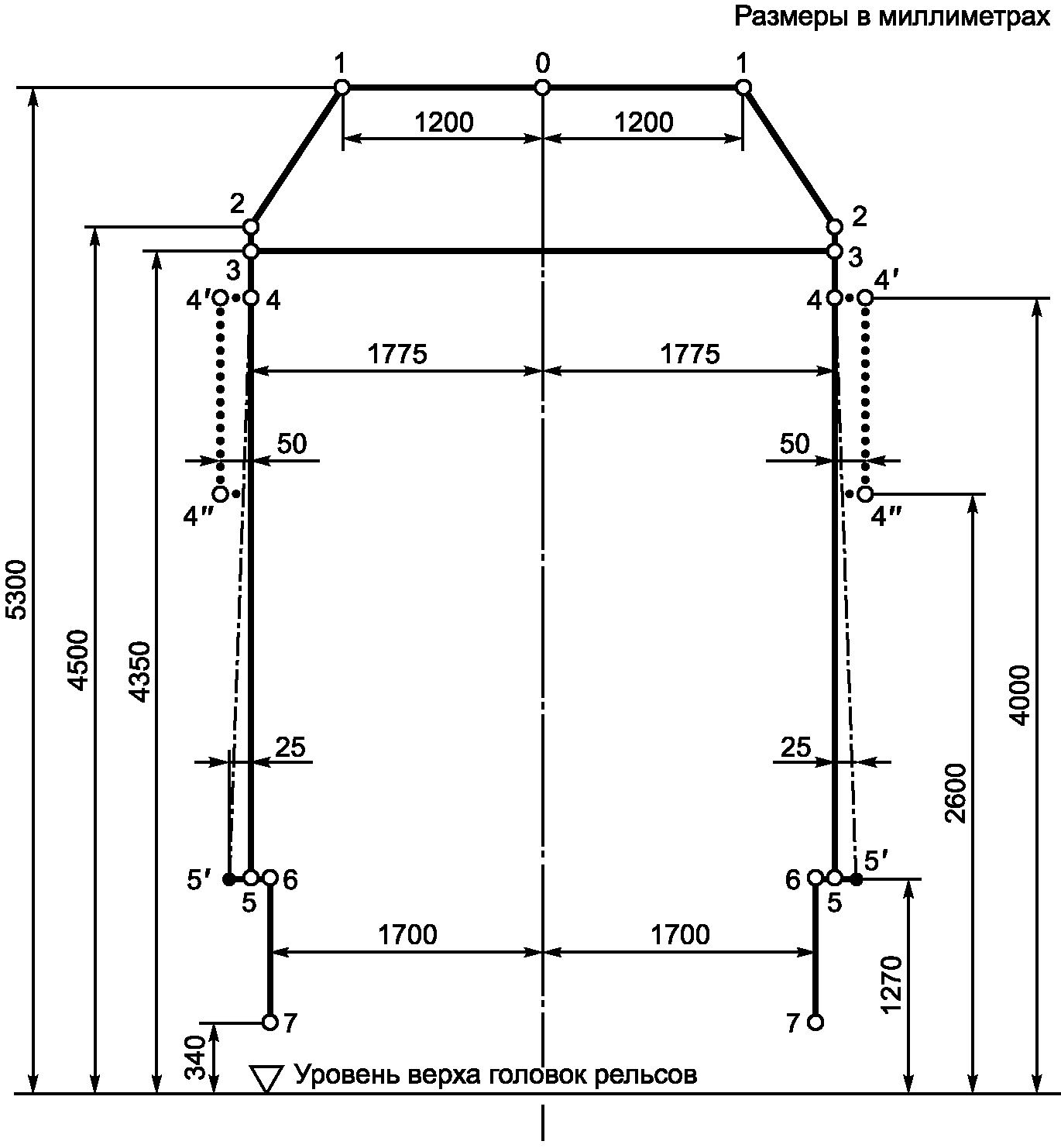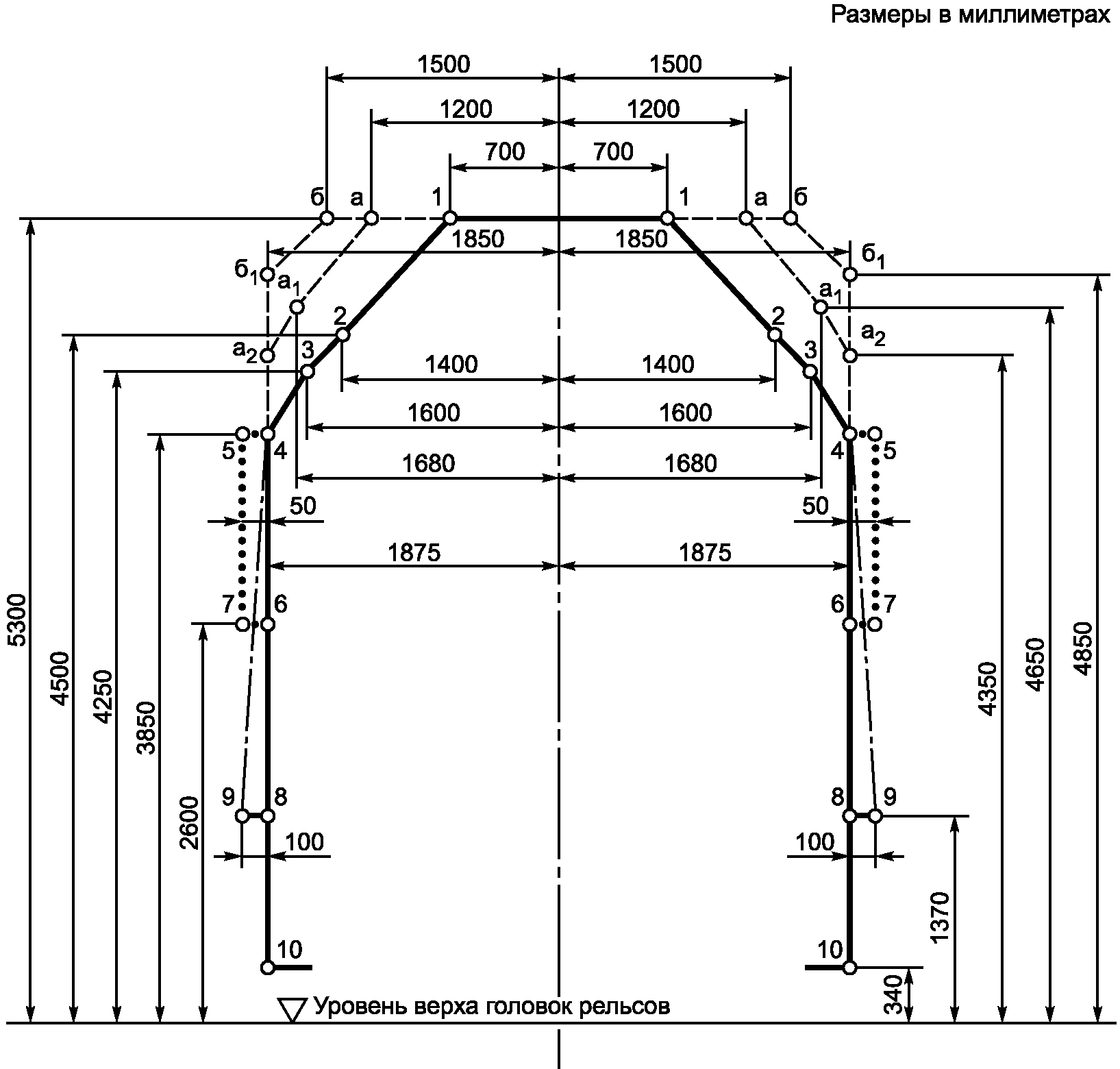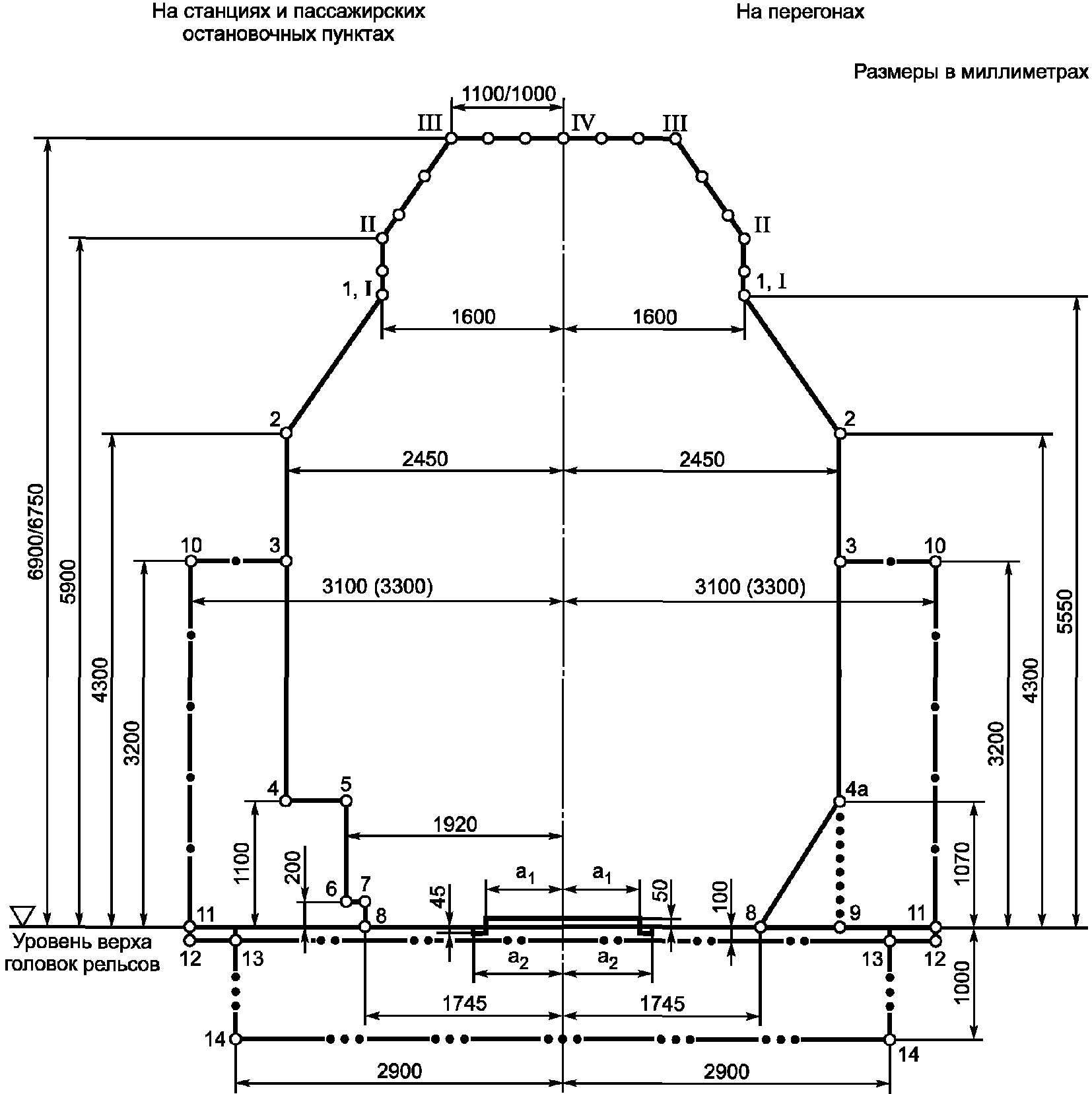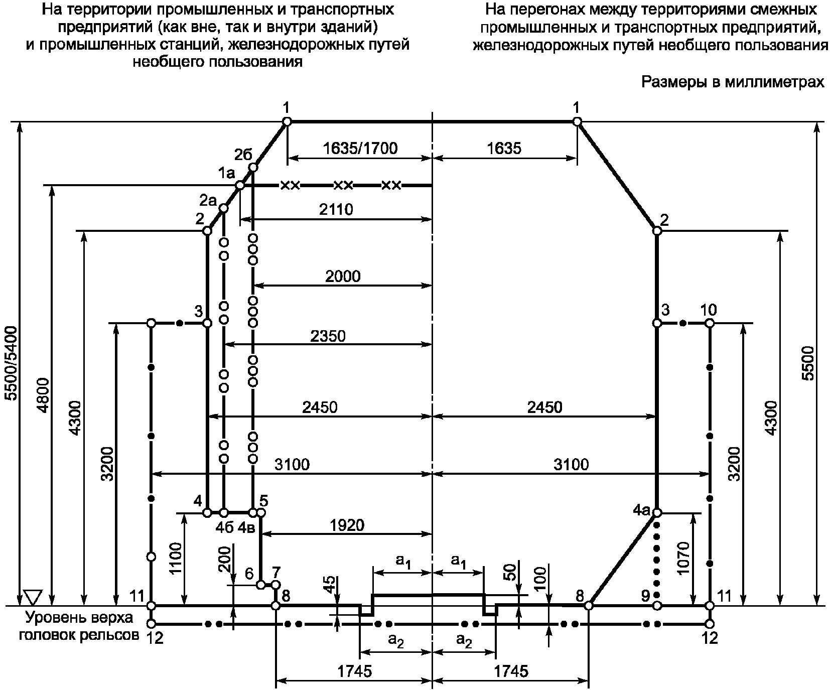 должны соответствовать указанным на рисунках 9 - 14. При этом габарит 1-BM, приведенный на рисунке 10, допускается увеличивать за счет дополнительной наклонной линии, имеющей расстояние от оси пути: 1700 мм - на высоте 3850 мм (точка 4); 1800 мм - на высоте 1160 мм (точка 9), для вписывания в габарит выступающих частей (поручни, подлокотники, козырьки для стока воды, параваны и др.) для подвижного состава, предназначенного к эксплуатации в пределах только железных дорог колеи 1520 (1524) мм.