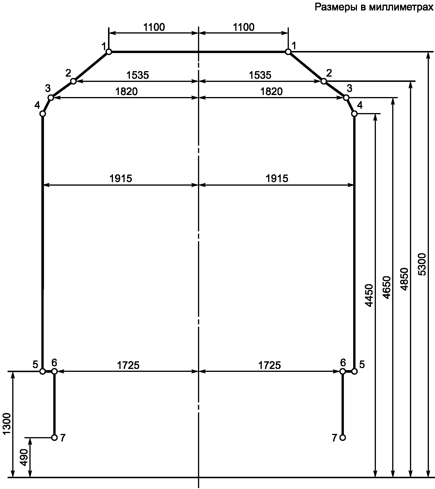 Наружное ограничение половины ширины исходного очертания габарита для сечений вагона, расположенных снаружи крайних осей двухосного вагона или снаружи шкворней тележек, м | |